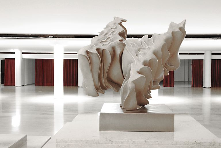 Grande scultura in grès, con smalto "bianco Zauli", generata dall'elaborazione di una forma geometrica cubica posta su un apice, percorsa e scavata con ondulazioni oblique. Il basamento è in acciaio e pietra naturale.