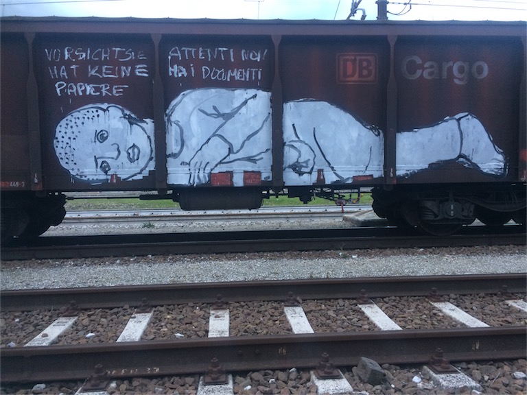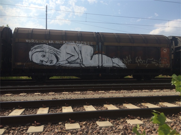 Figura umana dipinta con pennello e vernice al quarzo su convoglio merci della compagnia tedesca DB, fa parte di una serie tutt'ora in corso di realizzazione che conta più di 300 soggetti (2020).