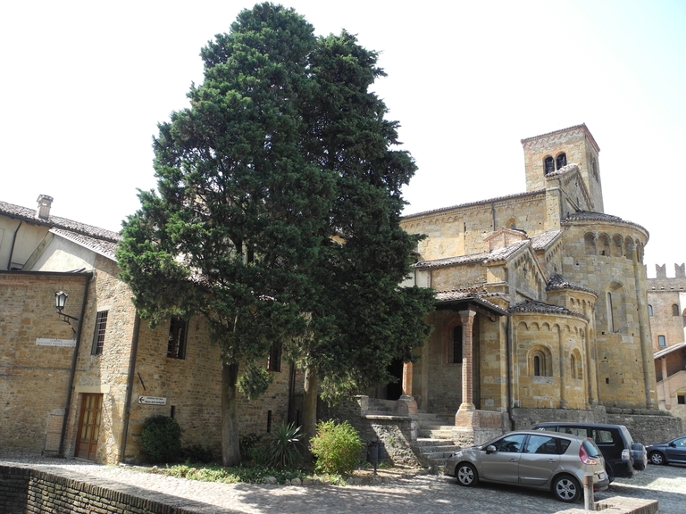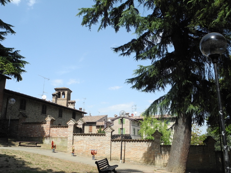 La storia di questo angolo del borgo oggi destinato a verde pubblico è strettamente legata alle vicende dell’adiacente Rocca Viscontea e della Collegiata. Una struttura difensiva (Castrum Quadratum) sul colle, in posizione dominante sulla valle, esisteva forse già in epoca romana. La presenza di un edificio religioso intitolato alla Vergine è documentata dal 789. La piccola chiesa venne però distrutta da un terremoto nel 1117 e ricostruita nel 1122; nel secolo successivo fu eretto il campanile. Tra la fine del ’200 e l’inizio del ’300 alla nuova chiesa fu aggiunto il suggestivo chiostro che oggi confina con l’area verde; nel ’700, modificando uno dei fianchi del complesso, vennero realizzate alcune cappelle laterali. Verso il fondovalle il borgo aveva iniziato ad assumere un perimetro definito già nel 1336, prima della costruzione della Rocca, quando Azzo Visconti fece erigere una cinta muraria di cui sono restano solo un paio di porte di ingresso. La Rocca venne edificata tra il 1342 e il 1349 durante il dominio di Luchino Visconti e, a differenza di altre, non venne nemmeno in seguito mai utilizzata come residenza. Per la costruzione della struttura militare, che doveva servire alla difesa dei soldati e del popolo in caso di necessità, i Visconti fecero demolire gli edifici di servizio sul retro del complesso religioso, il campanile duecentesco e anche un piccolo cimitero. Dai Visconti la rocca e il borgo passarono agli Sforza e nel 1707 entrarono a far parte del Ducato di Parma e Piacenza, dominio prima dei Farnese e poi dei Borbone. Divenuta di proprietà pubblica, la rocca è stata adibita a prigione sino al 1961 (una funzione che già aveva svolto in passato) ed è stata soggetta a lavori di restauro nel 1916, nel 1994 e nel 2003 (in questo caso per adeguarla alla nuova destinazione a museo). Le grandi alberature che svettano a fianco della rocca risalgono agli inizi del ’900, anche se l’odierno aspetto dell’area verde è legato alle sistemazioni del centro storico della fine del secolo scorso, che hanno visto tra l’altro provveduto a trasferire nel giardino una fontana che in precedenza arredava la grande piazza davanti al municipio.
