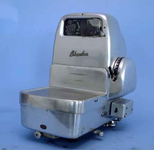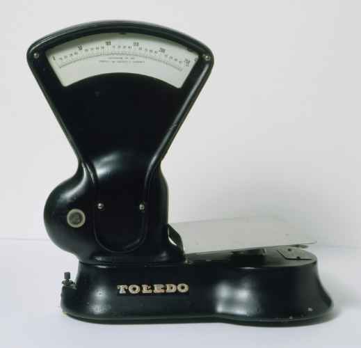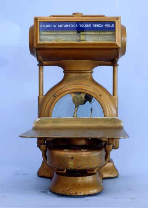 Bilancia automatica da banco in ferro cromato con portata 3 kg. La bilancia non è ispezionabile quindi non è dato sapere la tipologia delle leve poste all'interno del cofano, probabilmente si tratta di una semi disposizione Roberval. Gli indici a lancetta dipinti di nero con punta rossa ruotano su due quadranti circolari graduati, nel quarto superiore, da 0 a 3 kg con divisione 5 g. Due sottoquadranti mobili, hanno tracciate le cifre dei chilogrammi interi, visibili in una finestrella circolare ricavata nei quadranti. Per l'aumento di portata si spostano delle masse sul giogo tramite una manopola in plastica nera posta suI lato sinistro della base e dotata di sue scatti; in questo modo il quadrante parte da 1 a 2 kg e da 2 a 3 kg. I quadranti, in lamierino di ferro smaltato bianco, visibili ognuno da un lato della bilancia, sono riparati da un vetro. Una colonna in ferro cromato regge la testa a orologio della bilancia. La base è parallelepipeda in ferro cromato e poggia su quattro piedini a vite calante in gomma nera. Il piatto per la merce in inox è di forma rettangolare con un lato rialzato e poggia su una crociera in alluminio. Una bolla di livello di forma sferica è posta sulla base. Lo smorzatore per le oscillazioni del giogo è realizzato ad olio.