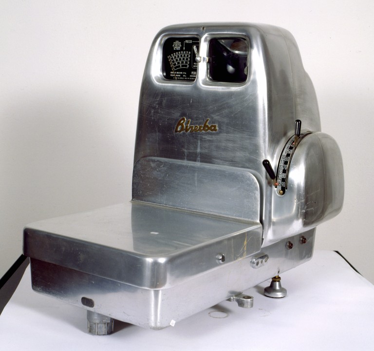 La bilancia automatica, nella teoria, era stata ideata da Leonardo che però non costruì strumenti simili. Le uniche bilance automatiche in uso fino alla fine del XIX secolo furono le bilance a pendolo e quelle a molla, che davano una lettura automatica del peso. La bilancia automatica Dujour, costruita dalla ditta francese Trayvou nel 1879, venne ammessa in Italia nel 1892 ma rimase pressochè sconosciuta: maggior fortuna ebbe invece la bilancia Chronos a carico costante ammessa nel 1897. Nel 1911 venne ammessa al commercio una bilancia ottenuta dalla combinazione fra una bilancia composta a sospensione inferiore e due dinamometri disposti verticalmente. Solo nel 1915 viene introdotta la bilancia Toledo a masse pendolari che eliminano l'uso delle molle. La prima bilancia Berkel ad essere ammessa alla verificazione in Italia ha il giogo pendolare compensato e risale al 1923. Le bilance automatiche hanno dapprima due piatti con pesi per aumento di portata poi un unico piatto e masse addizionali interne; il quadrante da forma di settore circolare (ventaglio) diventa circolare; da 1 giro di lancetta si passa a più giri di lancetta. La ditta tedesca Bizerba fu fondata nel 1866 a Ebingen da Wilhelm Kraut; in Italia fin dal 1926 ebbe ammesse alla verificazione numerose tipologie di bilance semi automatiche ed automatiche. Il presente modello, brevettato in Germania nel 1951, fu ammesso alla verificazione metrica in Italia con D.M. n. 322383 del 28 aprile 1952. Poteva avere la variante di un dispositivo per la tara e un quadrante sussidiario per i valori unitari dei prezzi compresi tra uno e nove.
