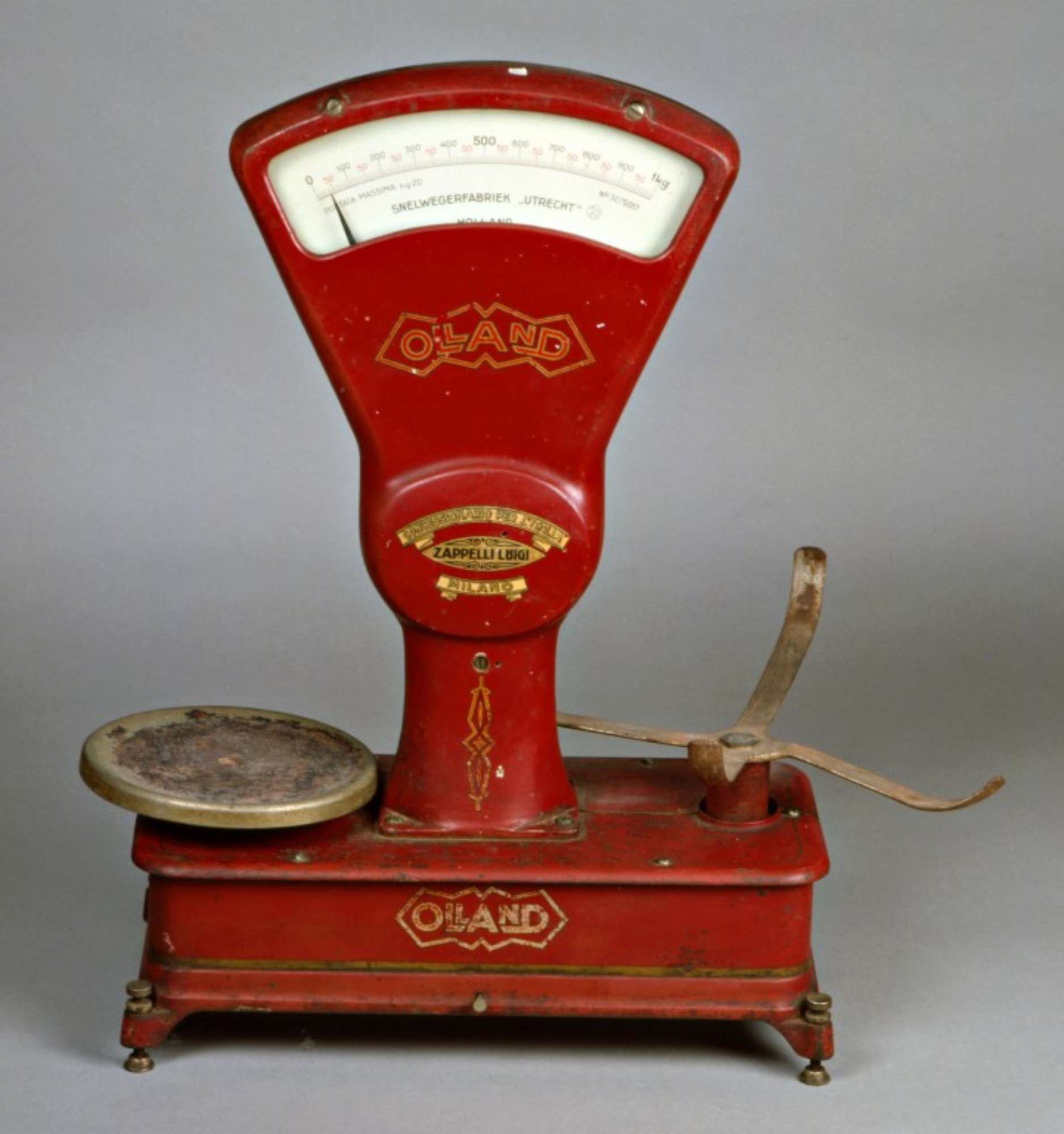 La bilancia automatica, nella teoria, era stata ideata da Leonardo che però non costruì strumenti simili. Le uniche bilance automatiche in uso fino alla fine del XIX secolo furono le bilance a pendolo e quelle a molla, che davano una lettura automatica del peso. La bilancia automatica Dujour, costruita dalla ditta francese Trayvou nel 1879, venne ammessa in Italia nel 1892 ma rimase pressochè sconosciuta: maggior fortuna ebbe invece la bilancia Chronos a carico costante ammessa nel 1897. Nel 1911 venne ammessa al commercio una bilancia ottenuta dalla combinazione fra una bilancia composta a sospensione inferiore e due dinamometri disposti verticalmente. Solo nel 1915 viene introdotta la bilancia Toledo a masse pendolari che eliminano l'uso delle molle. La prima bilancia Berkel ad essere ammessa alla verificazione in Italia ha il giogo pendolare compensato e risale al 1923. Le bilance automatiche hanno dapprima due piatti con pesi per aumento di portata poi un unico piatto e masse addizionali interne; il quadrante da forma di settore circolare (ventaglio) diventa circolare; da 1 giro di lancetta si passa a più giri di lancetta. Il presente esamplare è del tipo Olland 300, ammesso alla verificazione in Italia il 31 gennaio 1926 con Decreto Ministeriale n. 933.