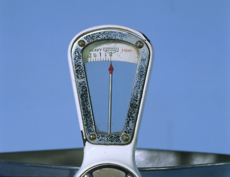 Bilancia semi automatica con leve di tipo Roberval. Un giogo pendolare di forma circolare, in alluminio, con contrappeso, è collegato alla disposizione Roberval tramite un nastro di acciaio. Due laminette in acciaio aventi forma semicircolare fungono da molla di ritorno per richiamare il giogo alla condizione di equilibrio una volta che vengono scaricati i piatti. Sul giogo pendolare è avvitato un indice a lancetta con punta dipinta di rosso visibile da entrambi i lati dello strumento. Il quadrante, in plastica (?) bianca, posto in cima ad una colonnina in ghisa smaltata di bianco, ha lo 0 al centro e da una parte le divisioni in positivo da 0 a 2 once g con divisione 1/4 di oncia e divisione numerata ogni 1/2 oncia; dalla parte in cui il peso è più leggero non vi sono divisioni ma solo scritto light in colore rosso. Il quadrante è riparato da due vetri avvitati alla colonnina ed è visibile da entrambi i lati dello strumento. Il cofano, in ghisa smaltata bianco, è chiuso alla base da una lamiera stampata verniciata di nero e poggia su quattro piedini a vite calante in alluminio. Entrambi i piatti sono movibili e realizzati in acciaio inox; quello per la merce è a doppia bocca di lupo e poggia su una crociera di forma concava con le estremità ricoperte di gomma nera; quello per i pesi è di forma rettangolare con un bordo rialzato. Uno smorzatore delle oscillazioni è posto sotto al piatto per i pesi ed è regolabile avvitandolo o svitandolo.