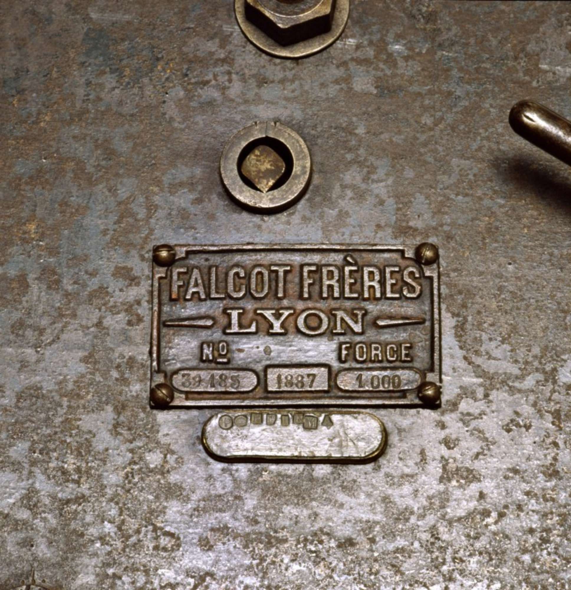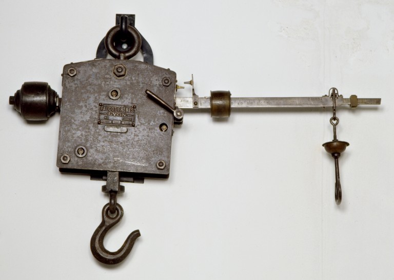 Questo sistema di tre leve, noto in Francia come bascule en l'air, fu brevettato dalla ditta lionese Catenot Béranger nel 1848; lo strumento del 1848 aveva però due punti di sospensione, che ne limitavano l'uso in particolari collocazioni; proprio per questo nel 1859 venne approvato il brevetto di uno strumento identico ma con un solo punto di sospensione. La ditta Falcot et Companie risulta essere a Lione, in Cours Lafayette, dal 1859 al 1875; nel 1876 la ragione sociale diventa Falcot, Mairet et Cie con sede in Chemin de St. Rambert. Dal 1885 al 1911 le succede la Falcot Frères che cambia sede dal 1904 (andrà in Chemin de Vacques 24). Per finire dal 1912 la ragione sociale si trasforma ancora una volta diventando Falcot et Jacquesson. La ditta Falcot, vincitrice di due medaglie a Parigi nel 1867, costruiva pesa ponte in bilico, bascule, bilance generiche e di lusso, pesi e misure. La presenza di 56 punzoni di verifica periodica annuale lascia trasparire un uso di vari decenni in situazioni concernenti ambiti commerciali; inoltre la presenza di quattro punzoni con la lettera N, in uso dopo il 1887 solo a partire dal 1905, conferma un utilizzo dello strumento nei primi decenni del XX secolo.
