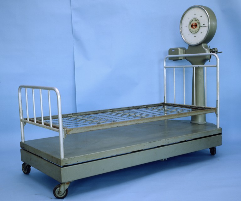 Bascula pesapersone sottostante un letto da ospedale con quattro ruote in gomma nera e testiera e ringhiera dalla parte dei piedi, in tubo di alluminio. Una rete metallica doveva accogliere il materasso. Sotto la base del letto vi sono due leve in ferro verniciato grigio ortogonali a forma di T con un tirante in ferro posto all'interno della colonna in alluminio martellato grigio che trasmette il peso ad un giogo in alluminio con asta di azzeramento pure in alluminio tarata da 0 a 100 kg con divisione 1 kg. Il romano è in alluminio cromato di forma parallelepipeda a manicotto; all'interno del romano è collocata una massa di correzione parallelepipeda, scorrevole e bloccabile nel punto desiderato tramite una vite, con tacche e numeri 0 e 9. Il giogo ha una grande massa di correzione in alluminio riparata da un cofano metallico. La testa di forma circolare è ispezionabile svitando un pannello posteriore. Il quadrante è in alluminio smaltato bianco tarato da 0 a 80 kg con divisione di 1 kg; sul quadrante vi sono otto finestrelle rettangolari per la lettura delle decine di kg. L'estremità superiore del tirante è collegata a due nastri di acciaio connessi a due settori circolari in fusione di alluminio martellato che ruotando fanno aprire due masse pendolari di forma cilindrica in ferro. L'indice è una lancetta in alluminio con punta smaltata di rosso e rotante sul quadrante grazie ad un sistema cremagliera-pignone. Nella parte posteriore della testa, sopra l'asta di azzeramento, si trova una leva in alluminio per il blocco/ sblocco della lancetta.