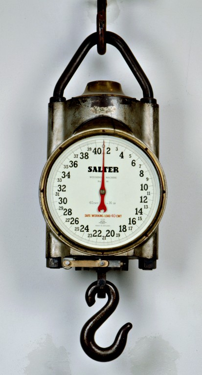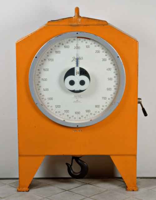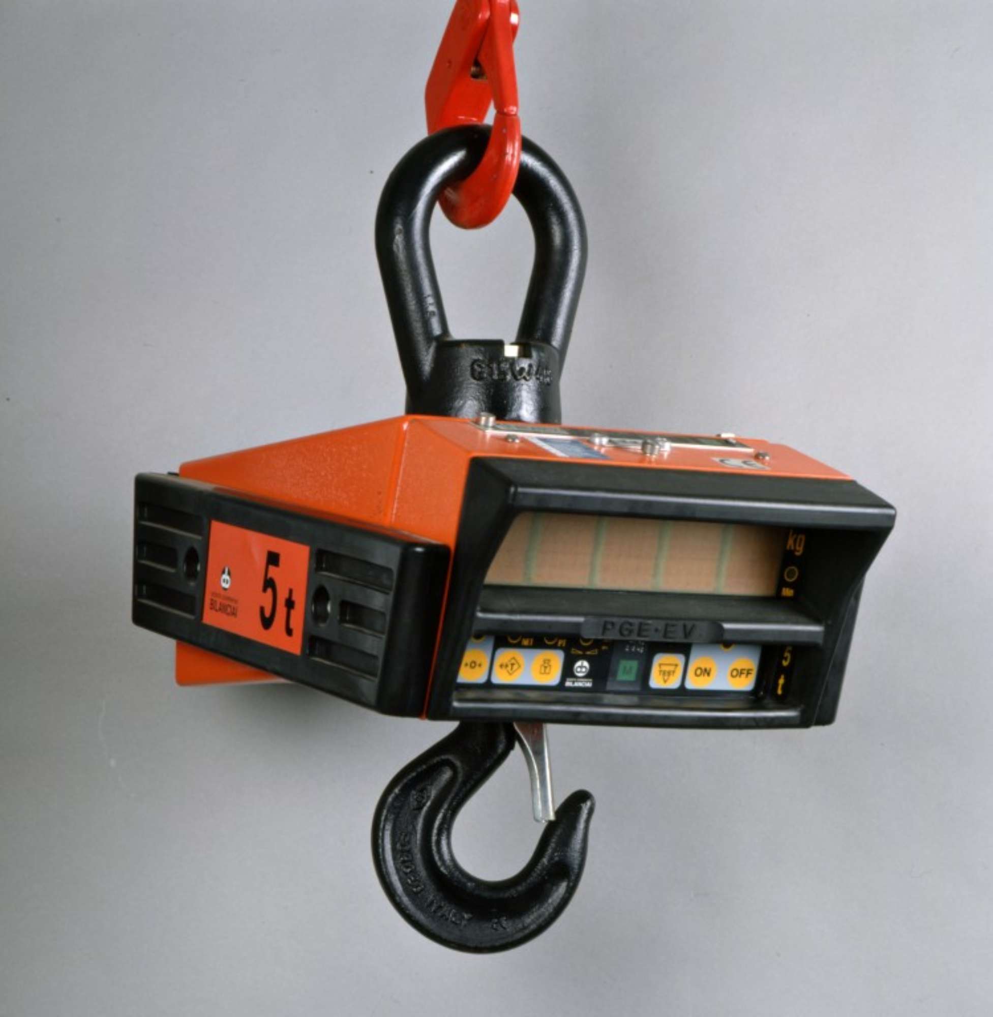 Pesagru elettronico in alluminio martellato smaltato in arancione a cella di carico di tipo estensimetrico versione multidivisione con due campi di pesatura: da 0 a 4 t con divisione di 2 kg e da 4 a 5 t con divisione 5 kg. Il pesagru, di forma parallelepipeda, ha un grosso gancio con linguetta di sicurezza in fusione di ghisa per sospendere il carico. La sospensione dello strumento avviene attraverso un grosso gancio di sollevamento in ghisa verniciato di rosso e un golfare. Sul fronte dello strumento è presente un pannello frontale costituito da un visualizzatore del peso composto da cinque display a LED e da una tastiera composta da tasti funzionali e indicatori luminosi. Due tasti sono per l'accensione/ spegnimento ON/ OFF; il tasto con parola TEST entro un triangolo con vertice verso il basso attiva le procedure di verifica del corretto funzionamento dello strumento. Il tasto raffigurante la sagoma di un peso entro cui è la lettera T visualizza il valore di una tara inserita; quello con lettera T entro rombo da cui entra o esce una freccetta serve per acquisire o cancellare una tara, il tasto zero fiancheggiato da due frecce è il tasto di azzeramento dello strumento. L'indicatore luminoso posto sul tasto di azzeramento indica che lo strumento è a zero; NET e PT si accendono per indicare un peso netto o una tara; i due triangoli affrontati segnano la condizione di peso stabile; le ultime due spie luminose indicano che lo strumento è acceso o che il peso è al di sotto del valore di pesata minima, ossia 40 kg. Sui fianchi e sul fronte del pesagru sono poste delle protezioni antiurto in gomma nera.
