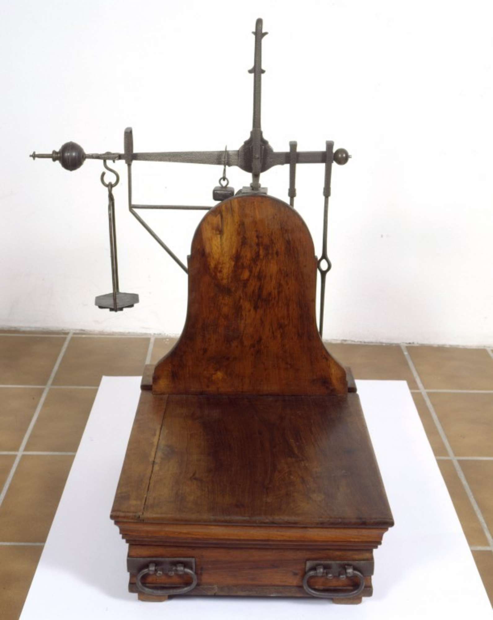 La prima stadera a bilico a noi nota è quella installata alla Birmingham Workhouse da John Wyatt nel 1741 ma solo a partire dal XIX secolo questo tipo di strumenti incominciò ad avere una grande diffusione. In Italia la bascula divenne un indispensabile strumento di lavoro a partire dalla seconda metà del XIX secolo sia in ambito rurale che per scopi commerciali, per i quali vennero costruite delle piccole bascule che potevano comodamente trovare posto sui banchi di vendita. Questo esemplare, per la particolare sagoma delle leve non pare di produzione italiana. I due bolli posti sotto al romano sembrano più una semplice impronta di un oggetto quadrangolare privo di incisioni che non un punzone vero e proprio.