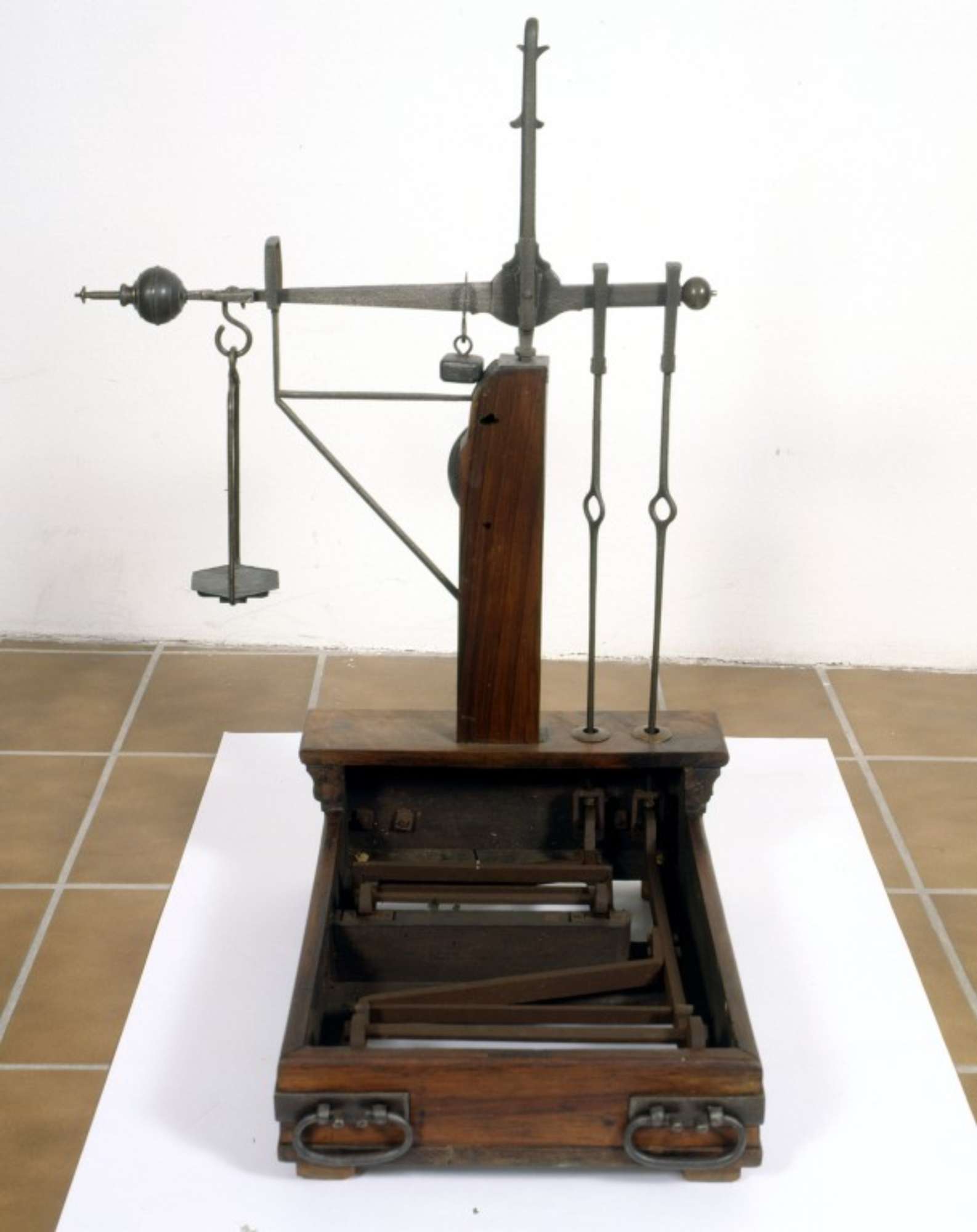 Bascula con giogo realizzato in ferro battuto a mano con coltelli riportati in ferro; il braccio maggiore, che reca labili segni di una taratura con tacche, verso l'estremità ha un doppio foro cui si sospende, con un gancio ad S e un tondino ad U rovesciata in ferro, il piattello per i pesi di rapporto di forma esagonale, appesantito nella parte inferiore da placche di metallo ribadite. L'estremità del braccio maggiore è filettata e vi scorre una sfera in ottone decorata da incisioni parallele. Il braccio minore, terminante con una piccola sfera in ottone, ha riportati due coltelli con staffe in ferro che collegano l'asta alle leve inferiori tramite due tiranti in ferro filettati e decorati nella zona centrale da un'apertura circolare. Sul braccio maggiore scorre un romano in ferro di forma parallelepipeda, che presenta recenti tracce di limatura sul fondo e due fori entro cui è colato del piombo. Il corrente, che si aggancia al romano con un cappio in ferro, è estraibile, con forma a C in ferro piatto lavorato mano. Il giogo è sostenuto da una colonna in legno, a sezione reattangolare, con braccio laterale sul quale è una staffa per contenere le oscilazioni del giogo. La parte anteriore della colonna è rinforzata da una lastra in ottone sulla quale è collocato il meccanismo per il sollevamento del giogo, mobile con una manovella in ferro a forma di spirale e pomello in ottone. Due piccoli fili a piombo costituiti da due coni in ottone con i vertici opposti l'uno all'altro verificano l'orizzontalità della bascula. La colonna nella sua estremità superiore si prolunga con una lamina di ferro battuto a mano terminante con lancia con punta verso il basso che va a formare il riferimento per l'indice, realizzato in un unico pezzo col giogo, a forma di lancia verso l'alto. Sistema di due leve ad angolo di forma trapezoidale realizzate in ferro con coltelli e cuscinetti in ferro; le leve non sono opposte ma in linea, la maggiore è fissa, la minore oscillante. Cassa di forma rettangolare in legno di noce poggiante su quattro piedi in legno e recante sui lati corti due maniglie di forma circolare schiacciata in ferro battuto per il trasporto dello strumento. Agli angoli della cassa sono avvitati quattro rinforzi angolari in ferro. La piattaforma, di forma rettangolare, ha un frontale arrotondato in legno.