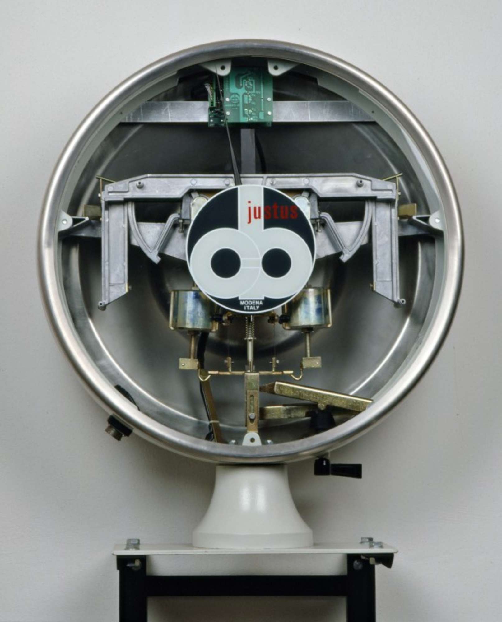 Testa di bilico automatico cui è stato tolto il quadrante per consentire la visione degli organi interni. La testa è stata staccata dal bilico nel punto in cui si innestava sulla colonna. Sul lato destro della testa è posta una leva in plastica nera per il blocco/ sblocco della lancetta, sul lato sinistro c'è un attacco circolare per uno spinotto di alimentazione elettrica. All'interno della testa in alto è collocato un piccolo quadro elettrico. Nella zona centrale della testa sono visibili le masse pendolari che si aprono lateralmente all'applicazione di una massa al tirante, i due settori circolari in fusione di alluminio e i nastri di acciaio. L'indice è una lancetta in ferro o alluminio smaltato nero e rotante grazie ad un sistema cremagliera-pignone.