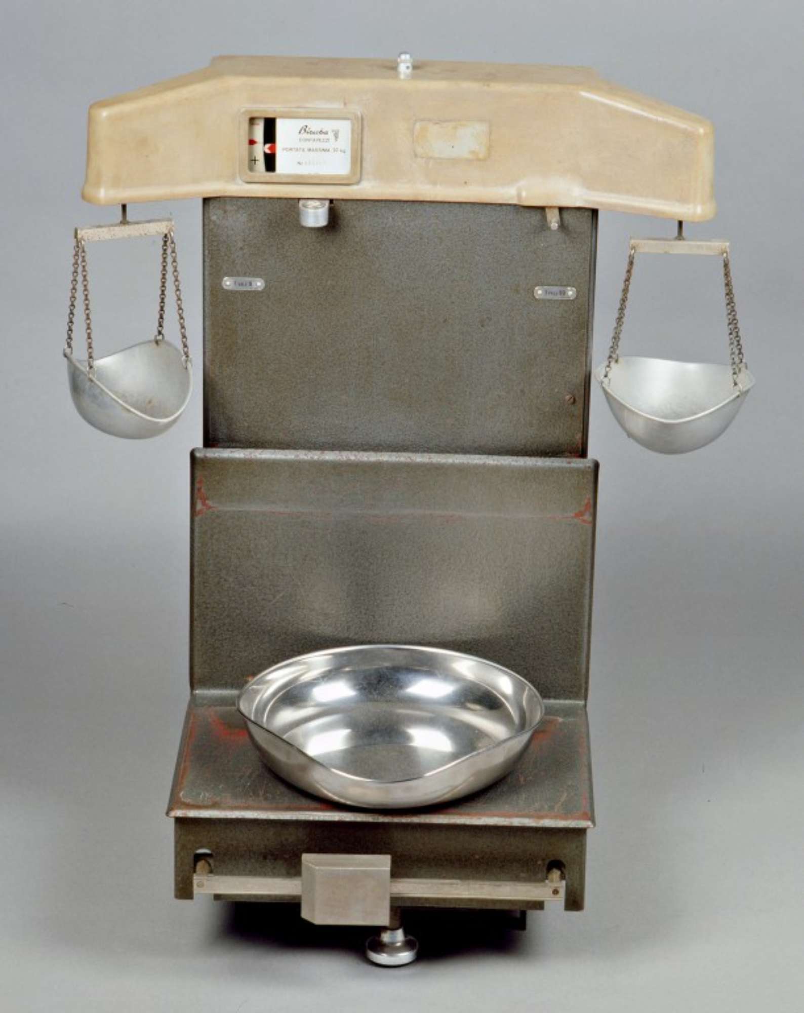 Bascula contapezzi con leve in alluminio e coltelli e cuscinetti in acciaio. Alle leve è connesso un braccio di trasmissione in ferro che tramite staffa e tirante le collega al giogo, in alluminio con coltelli di acciaio. Una piastra in alluminio connessa al giogo gli impedisce, tramite sei distanziatori in ferro, il movimento parallelo a se stesso. Il giogo mediante due staffe e due tiranti è collegato ad altri due bracci: un braccio è in ferro e regge con staffa, gancio ad uncino e quattro catene ritorte un piattello in alluminio a forma di ciotola con il rapporto 1:9 rispetto al piatto dello strumento; l'altro braccio è in alluminio e regge con staffa, gancio ad uncino e quattro catene ritorte un piattello in alluminio a forma di ciotola con il rapporto 1:99 rispetto al piatto dello strumento. Sul braccio con piattello 1:99 è connesso un indice in lamina di alluminio a forma di lancetta orizzontale con punta rossa che trova corrispondenza su una piastra di riferimento in ferro che ha indicati i segni – + e la posizione di equilibrio visibile da una finestrella nella bilancia. Sul medesimo braccio c'è anche un meccanismo con molla piatta a C per il blocco e sblocco del braccio quando non utilizzato. La messa a riposo dello strumento si attua spostando una levetta, posta nella parte inferiore e posteriore dello strumento, la quale tramite due tiranti e due molle elicoidali blocca o sblocca i bracci che reggono i piatti spingendo o ritraendo due punte metalliche che si infilano in due fori praticati nei bracci stessi. La messa a zero dello strumento avviene grossolanamente spostando un peso in alluminio di forma parallelepipeda scorrevole su un braccio pure in alluminio connesso alle leve; per gli aggiustamenti di precisione si ruota una manopola in alluminio posta sulla sommità dello strumento che mediante vite, molla elicoidale e molla piatta compie delle piccole regolazioni sull'asta. La cassa, realizzata in ferro martellato e verniciato di grigio, è ispezionabile smontando la base per il piatto, ora mancante, il pannello anteriore e la calotta superiore realizzata in plastica. Il piatto era appoggiato su una base basculante mediante quattro sferette in ferro. Lo strumento poggia su due piedi in ferro e su tre viti calanti in alluminio; una bolla di livello permette di valutare quando la bilancia è in posizione orizzontale.