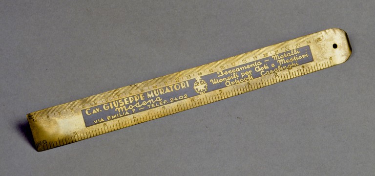 Questa misura è stata realizzata come gadget dalla Ferramenta Muratori di Modena e non serviva per usi commerciali, la misura infatti non presenta alcun punzone di verificazione e la scala graduata in pollici ha erroneamente i pollici suddivisi in 10 linee anzichè 12. La Ferramenta Muratori fu un negozio molto grande, importante e fornito, che aveva la sua sede in via Emilia angolo corso Canalgrande (attuale negozio Benetton). Importava direttamente dall'estero, soprattutto dalla Germania. Come banco del negozio e per gli scaffali vennero riutilizzati dei mobili che vennero alienati dall'ex Palazzo Ducale di Modena quando, dopo il 1859, decadde il governo austroestense. La Ferramenta Muratori, di proprietà di Malaguti Walter, esiste tuttora, nei locali di via Taglio 42/48 a Modena, ed ha mantenuto gli arredi originali.