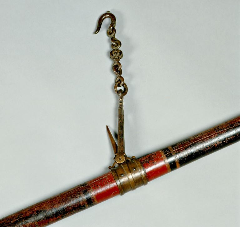 Giogo di bilancia a bracci uguali da mercato in legno esotico a sezione cilindrica rastremata verso le estremità. Il giogo è verniciato di nero e decorato, nella zona centrale e delle estremità, da una fascia rossa e due color ocra. Al centro del giogo vi è un manicotto in bronzo cui è saldato l'indice a lancetta rivolto verso l'alto, alla base del quale è riportato un coltello in ferro per il fulcro. Alle estremità vi sono dei cappucci in bronzo, decorati da linee parallele, che recano un foro e un doppio gancio lavorato a mano per la sospensione dei piatti, probabilmente tramite corda. La sospensione dello strumento avviene con un complesso di ganci in bronzo riccamente lavorati e costituiti da un anello, un gancio ad otto, un gancio ad occhiello, una sfera traforata, un gancio ad occhiello, un gancio ad otto ed un gancio ad uncino.