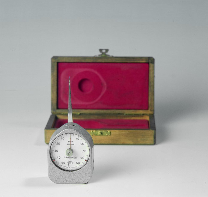 Bilancia con molle piatte flessibili per la misura di una forza trasversale all'ago. Il dispositivo a molla è costituito da due lamine in rame che fungono da molla, ognuna delle quali è fissata ad un'estremità mentre flette dall'altra quando lo strumento è caricato. Il dispositivo è collocato in una scatola di alluminio di forma pentagonale con lati arrotondati ispezionabile togliendo uno sportello avvitato sul retro. L'indice è in acciaio smaltato di rosso a forma di ago rotante grazie ad una cremagliera e ad un pignone e si muove in solido col braccio a contatto col corpo di cui si vuole misurare la forza. Sull'indice è posta un'altra lancetta rotante che viene spinta dall'indice in movimento durante l'operazione di pesata ad indicare sulla scala graduata il peso rilevato; questo indicatore viene riportato manualmente sullo zero della scala graduata mediante una ghiera posta sul fronte dello strumento. La scala graduata è in plastica bianca di forma circolare riparata da una lastra in plastica trasparente con doppia taratura da 0 a 50 g con divisione di 1 g. Sulla scala graduata ci sono anche due freccette rosse che possono essere spostate manualmente.