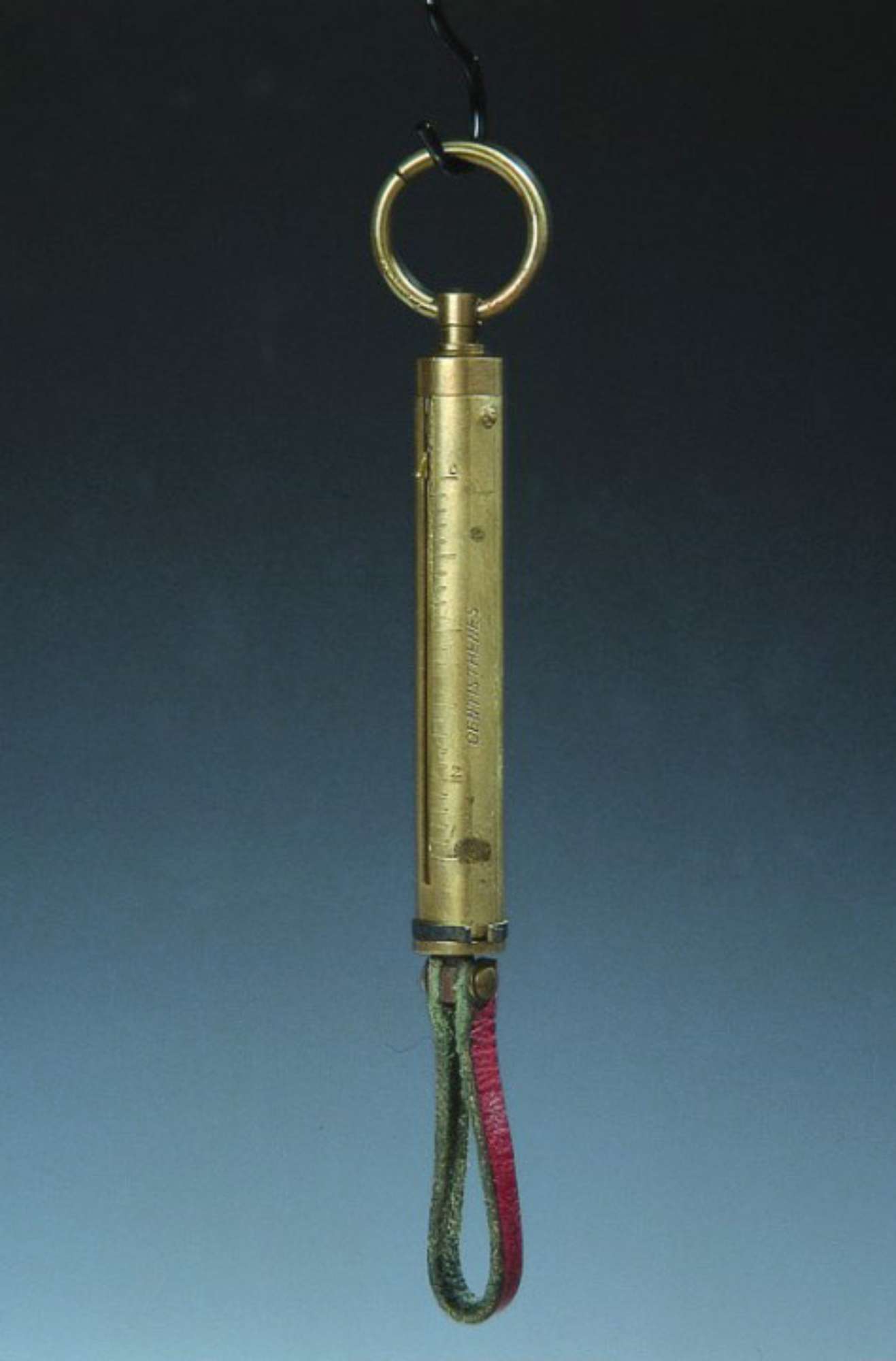 Bilancia con molla elicoidale in acciaio funzionante per estensione. La molla è contenuta in un doppio cilindro di ottone scorrevole l'uno dentro l'altro; all'estremità superiore è appeso un anello in ottone per la sospensione dello strumento; all'estremità inferiore c' è un gancio ad occhiello in pelle rossa non originale per appendere la merce. L'indice è ricavato sul cilindro interno scorrevole e scende attraverso una fessura verticale recante da un lato una scala graduata tarata da 0 a 2,5 ( kg ?) con divisione di 100 (g?).