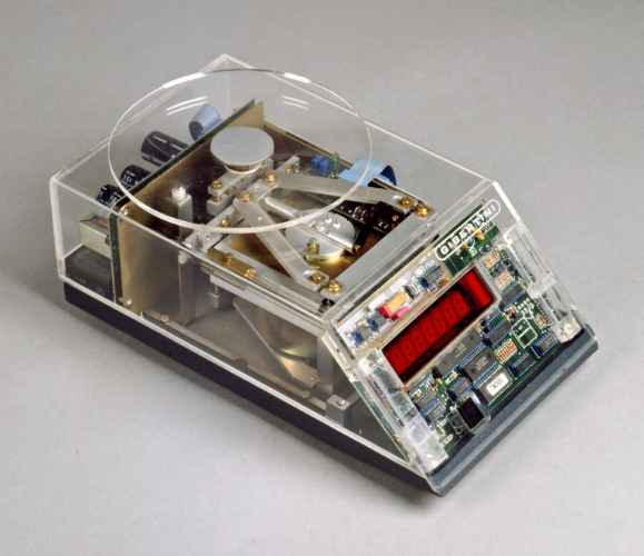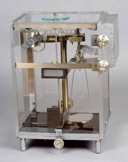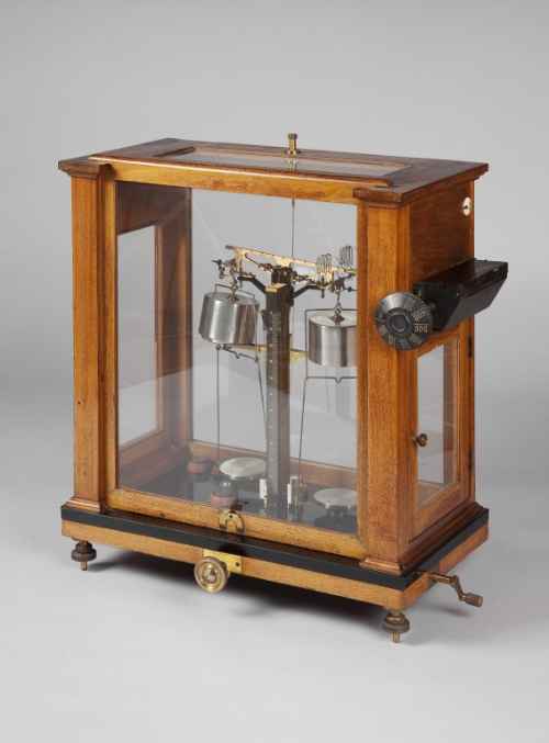 Bilancia analitica a bracci uguali con giogo traforato in lega di alluminio con viti di regolazione per l'equilibrio della bilancia e del baricentro. Coltelli e piani d'appoggi in agata. Colonna in ottone con sistema di sollevamento del giogo con bracci articolati e di arresto dei piatti azionabile con manopola esterna. In cima alla colonna è presente una bolla di livello. Indice in lega di alluminio a forma di ago rivolto verso il basso con relativa scala graduata in osso avvitata alla colonna. La lettura della scala graduata avviene su un telaietto con una lettura a proiezione. Sospensioni a staffa con viti di regolazione per il parallelismo e la complanarità dei coltelli. Doppio gancio per la sospensione degli smorzatori ad aria in alluminio e ottone e dei piatti. Aste rigide in ottone nichelato, munite di gancetto supplementare, sostengono i piatti in ottone nichelato di forma circolare leggermente concavi con bordi ribassati. Vetrina in legno di rovere con sportello anteriore sollevabile a contrappeso e sportelli laterali fermati con pomello e gancio. La vetrina ha il piano in cristallo nero ed è sostenuta da tre piedini di cui due con viti calanti regolabili. Sul lato destro della vetrina c'è un meccanismo a doppia manopola coassiale per il caricamento delle masse minori, da 10 a 990 mg, azionabile dall'esterno con indice a bandiera. Sul piano è montato il meccanismo per la lettura a proiezione della scala, composto da lampada posteriore esterna e gruppo ottico con microscopio e viti per la regolazione della messa a fuoco e dello spostamento della scala.
