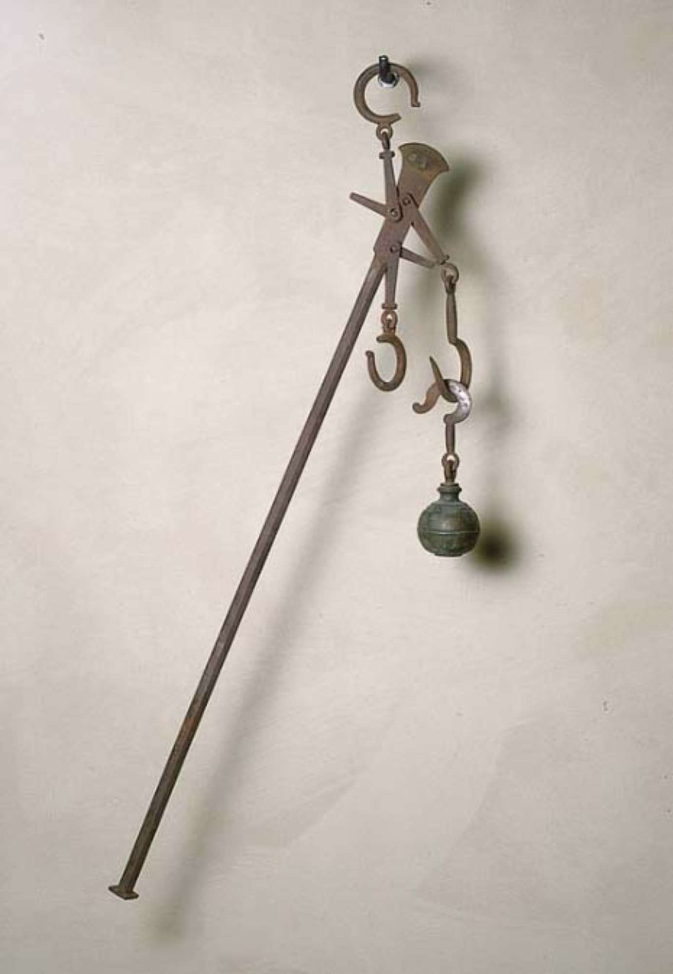 Asta in ferro tarata da 14 a 56 kg con divisione di 200 g per la portata minore e da 55 a 178 kg con divisione di 500 g per la portata maggiore. Il braccio minore di forma piatta ha i coltelli riportati in acciaio. Il braccio maggiore a sezione quadrata termina con una testa in ferro di forma quadrata. Il romano in ottone di forma sferica con cavità per la massa di correzione chiusa da una vite, ha un cappio in ferro congiunto ad un corrente estraibile in ferro con gancio piatto ad uncino arrotondato. La stadera è sospesa mediante staffa, gancio ad occhiello e gancio a C in ferro. La merce è sospesa mediante gancio ad uncino, gancio ad occhiello e staffa in ferro.