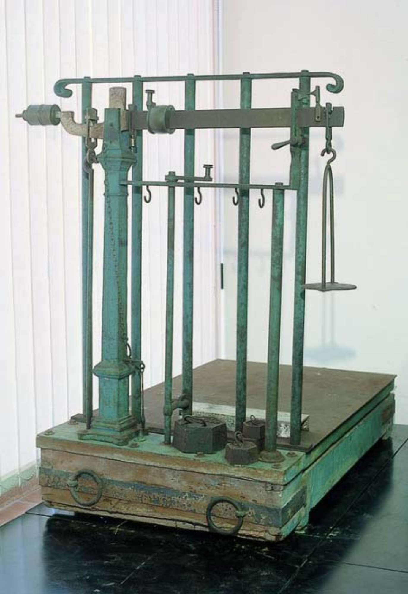 Bascula con giogo realizzato in ferro con coltelli riportati in acciaio, tarato da 0 a 100 kg con divisione di 1 kg per la scala su cui scorre il romano e da 0 a 10 hg con divisione di 100 g per la scala su cui scorre il nonio. Il romano è in ottone a manicotto con dente in ferro; il nonio in ottone di forma cilindrica con bottone e cavità per la massa di correzione chiusa da una vite in ottone ha corrente piatto in ferro non estraibile. All'estremità del braccio maggiore è sospeso, mediante staffa in ottone, un piattello circolare in ferro per i pesi di rapporto sostenuto da tondino di ferro ripiegato ad U. All'estremità del braccio minore è posta una massa di correzione in ottone di forma cilindrica regolabile mediante apposita chiavetta in ferro con tracce di vernice turchese sospesa alla colonna mediante catena alla catalana ad anelli allungati in ferro con tracce di vernice turchese. Il giogo è sostenuto da una colonna in ghisa con tracce di vernice turchese a sezione quadrata, con modanature e scanalature verticali. Tale colonna è dotata di un braccio laterale in ferro con meccanismo per la messa a riposo del giogo e quattro ganci in ferro per la sospensione dei pesi di rapporto. Indici contrapposti in ottone montati rispettivamente sul giogo e sul braccio laterale della colonna. Il giogo è raccordato al sistema di leve mediante tirante e staffa in ferro. Sistema di due leve fisse ad angolo realizzate in ferro con coltelli e cuscinetti in acciaio. Bilancieri in ferro. Cassa di forma rettangolare in legno con tracce di vernice turchese con piattaforma in ferro e frontale costituito da cinque tondini in ferro verniciati turchese. Rinforzi angolari in ferro con quattro anelle in ferro per il trasporto dello strumento. Freno per il fissaggio della piattaforma durante l'operazione di caricamento costituito da un gancio ad uncino in ferro. Filo a piombo in ottone per il controllo dell'equilibrio.