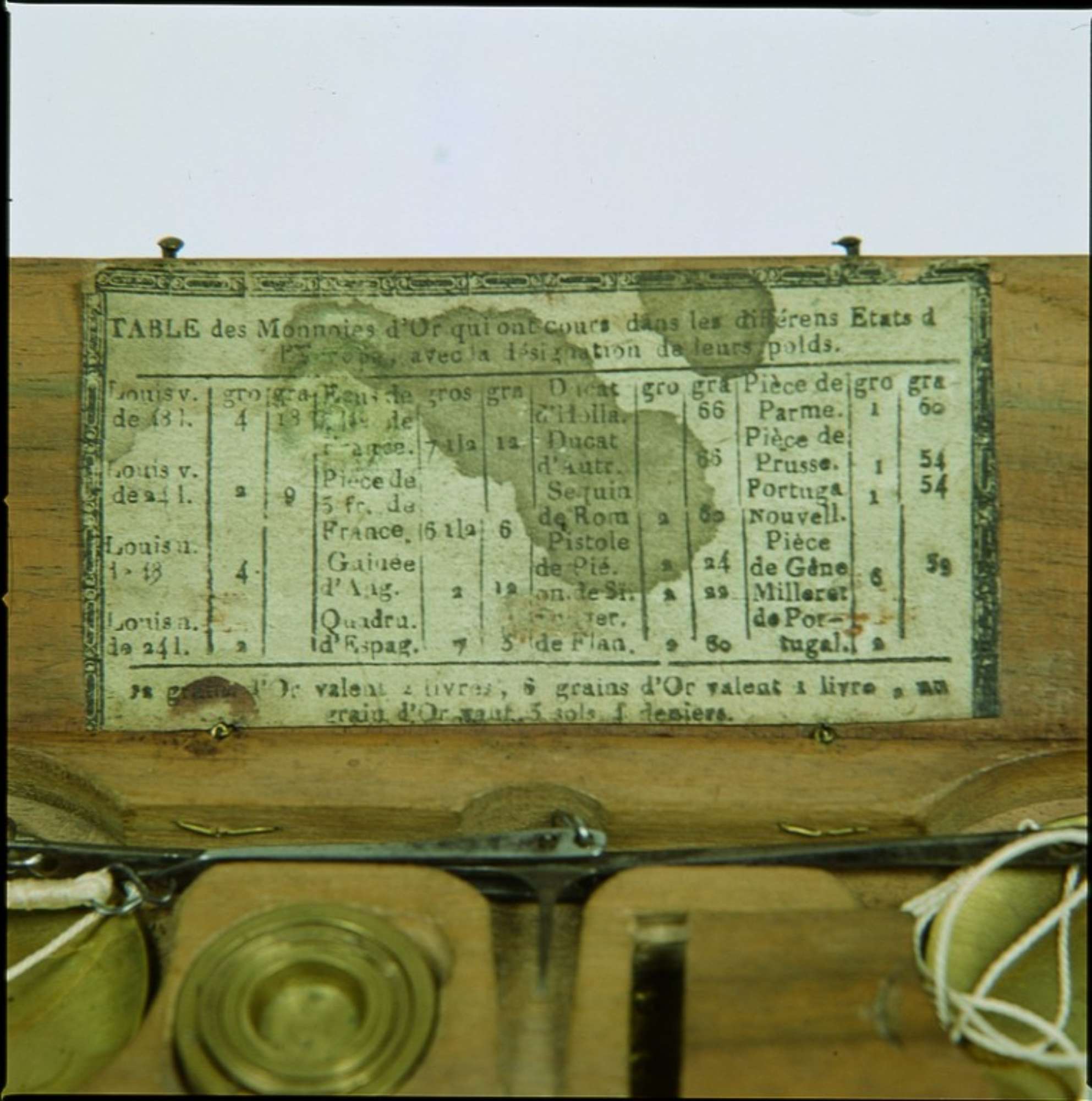 Custodia in legno di noce di forma rettangolare con estremità arrotondate e con incavi per l'alloggiamento della bilancia e dei pesi; lo spazio per i pesi frazionali è dotato di coperchio a baionetta. La custodia contiene quattro pesi a bicchiere in ottone e quattro fogliette in ottone di massa 6, 4, 3 e 2 grani. Manca il peso più piccolo a bicchiere. All'interno del coperchio della custodia è incollata una tabella cartacea in lingua francese relativa ai pesi e alle valute delle monete d'oro che circolavano in Europa nel XVIII secolo.