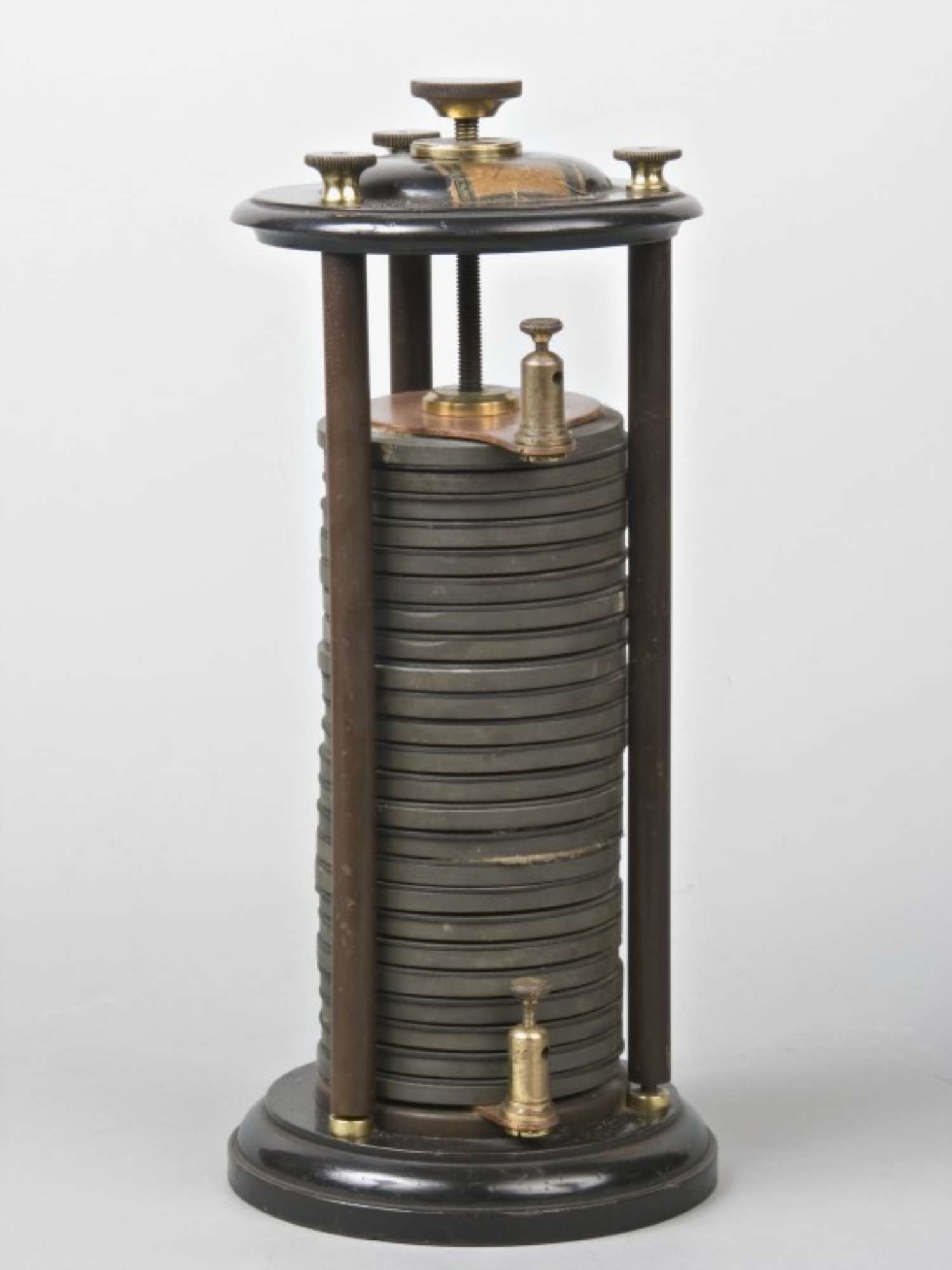 L'oggetto è sorretto da una struttura a colonna ed è costituito da una serie di dischi di rame e zinco intervallati da dischi di feltro a formare una "pila". I dischi di rame e zinco che si trovano alle due estremità della colonna costituiscono i due poli della pila.