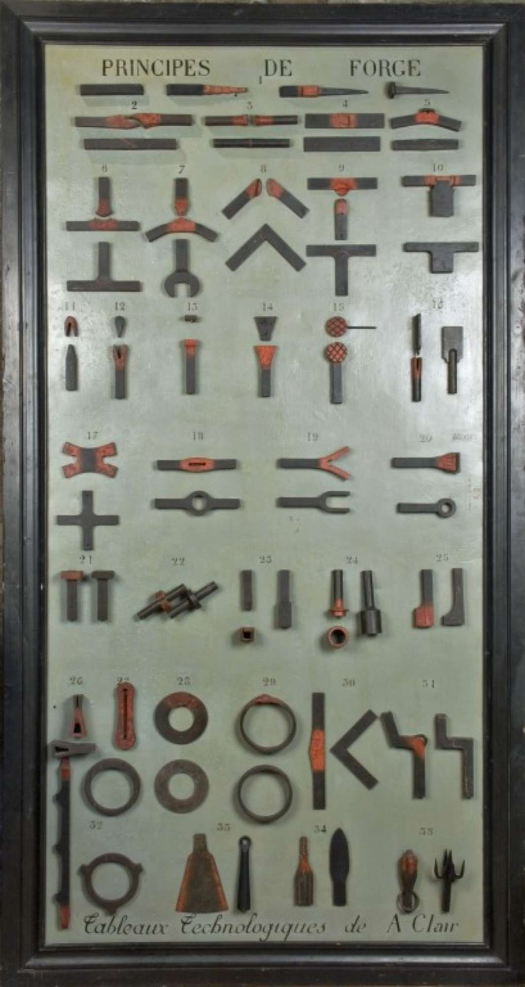 La tavola riporta in altorilievo, contrassegnati da numeri dipinti in nero, 35 esempi di lavori di fucina.