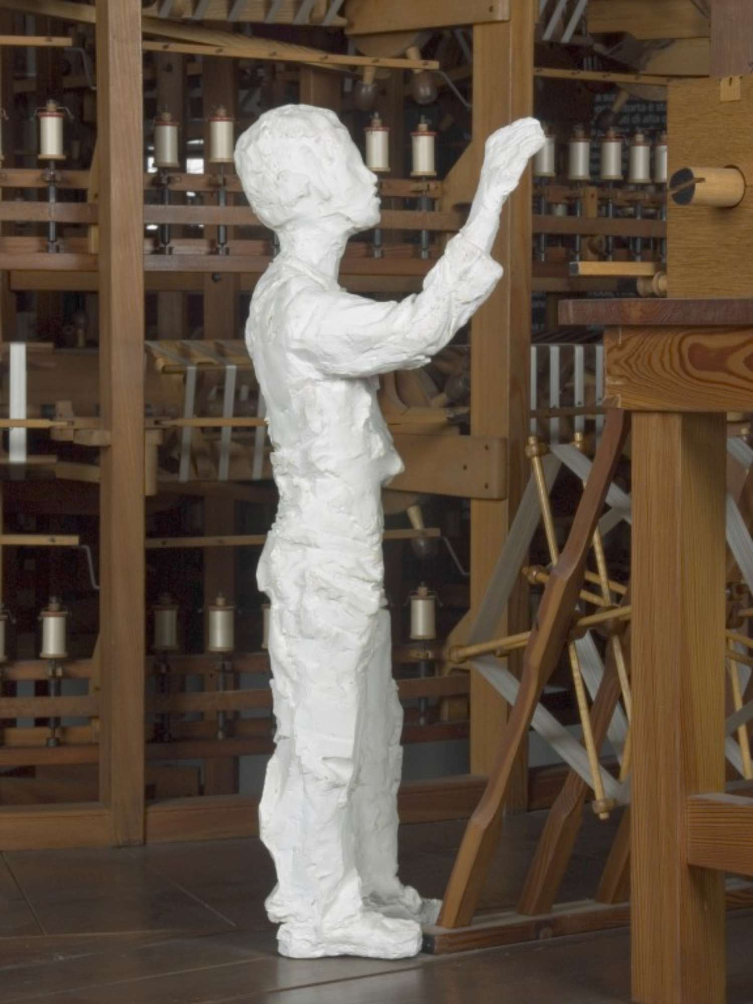 Scultura in gesso rappresentante un bambino con la mano destra alzata come a prendere qualcosa.