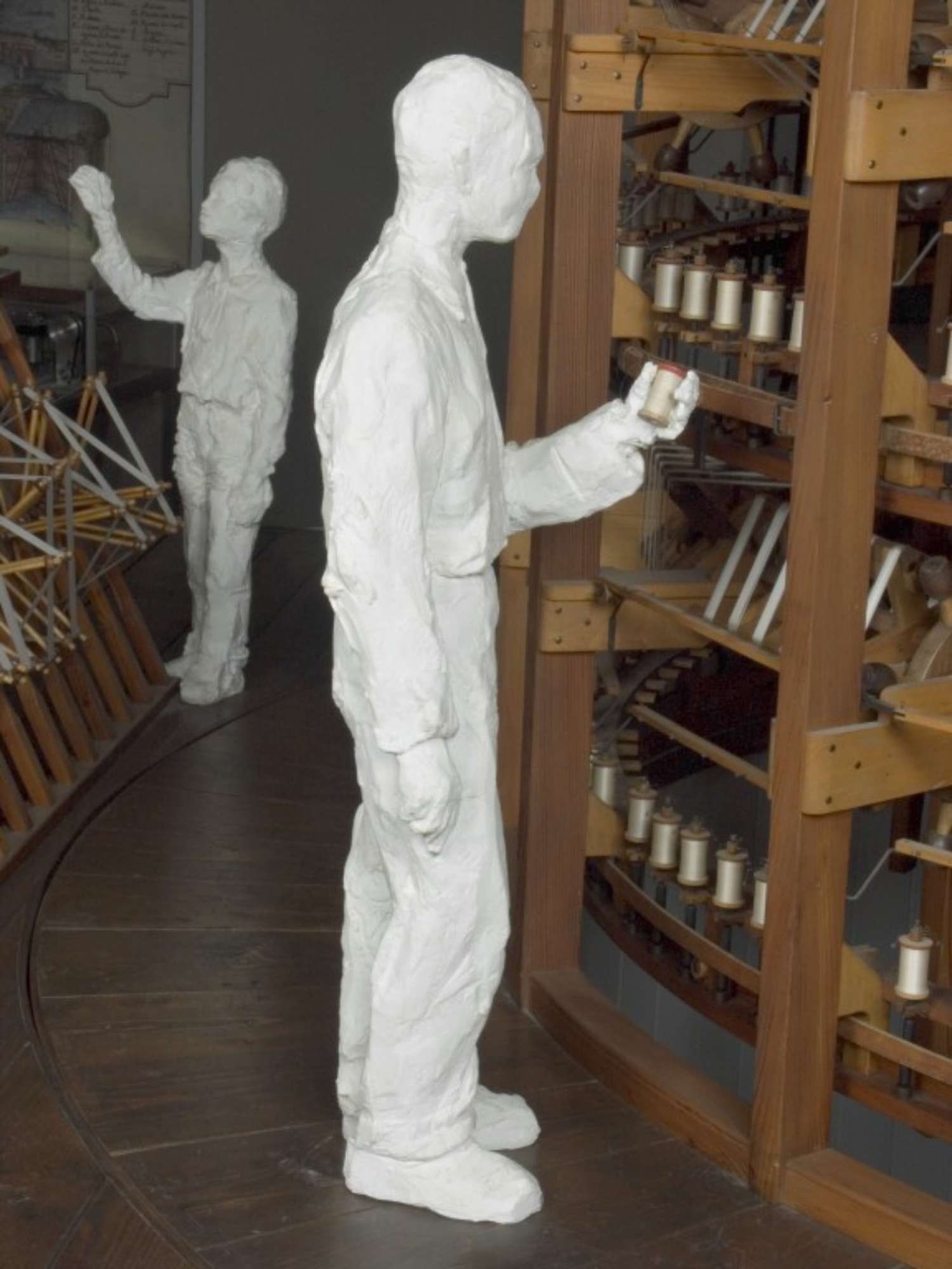 Scultura in gesso rappresentante un uomo in scala 1:2 con in mano un rocchetto.