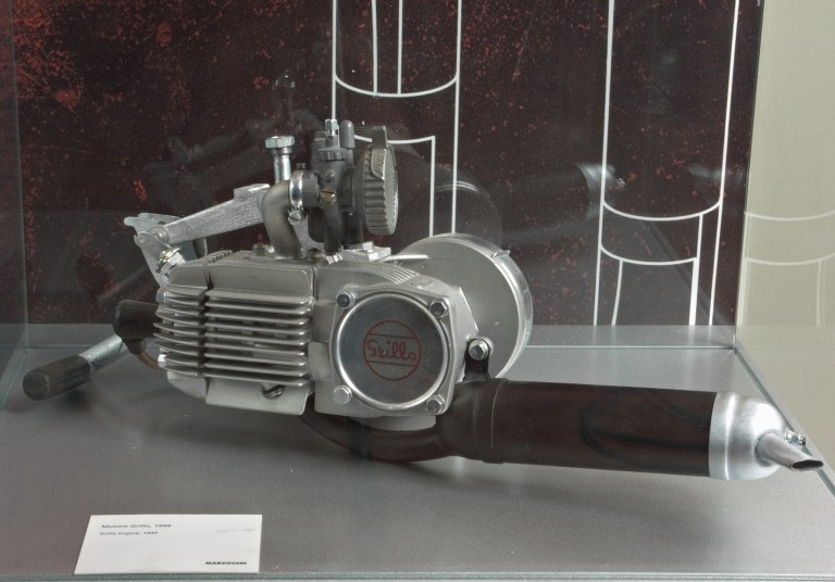 Motore a scoppio ausiliario con carburatore e tubo di scarico da applicare al telaio di motocicli.