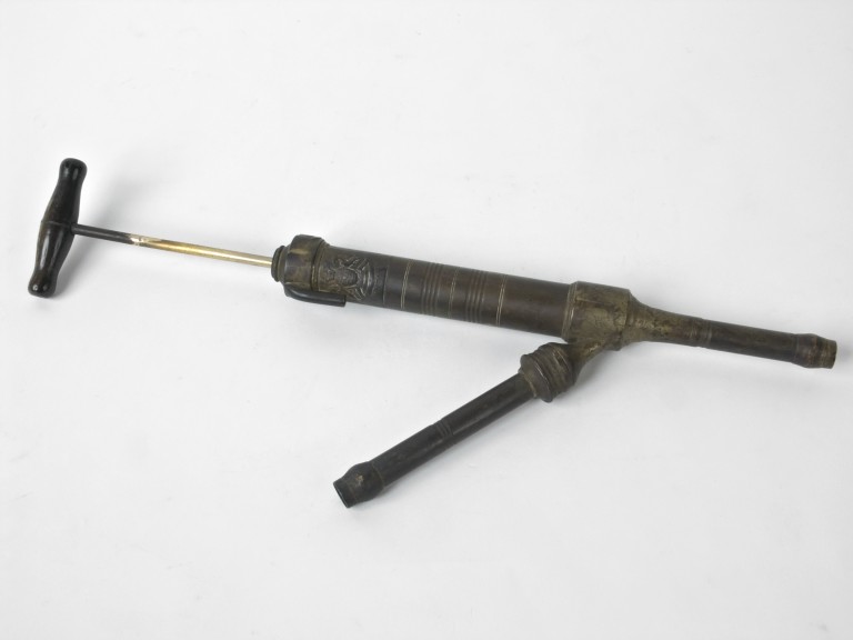 Lo strumento è costituito da un tubo di ottone terminante con un beccuccio, al cui interno scorre uno stantuffo, manovrabile da un manubrio in osso. Dal tubo parte lateralmente un secondo condotto più piccolo.