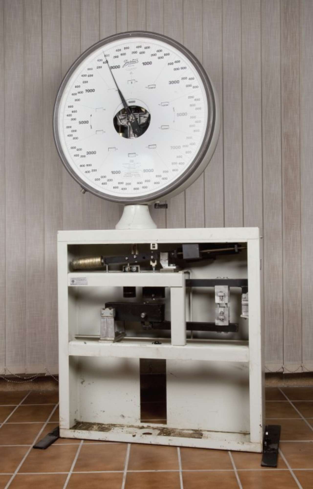Apparecchio pesatore per bilancia automatica a piattaforma modello Justus 75 con giogo in ferro verniciato nero con coltelli riportati in acciaio e masse cilindriche in ottone scorrevoli su vite per la messa a zero dello strumento. Un secondo dispositivo per la messa a zero "di aggiustamento" di piccole masse avviene ruotando l'albero filettato accessibile mediante un piccolo oblò circolare posto sul lato destro della colonna. Al braccio principale è raccordata, mediante un tirante ausiliario e una staffa in alluminio, una seconda asta e a questa una terza asta supplementari, che consentono di mantenere la lunghezza delle leve ridotta a fronte di una grande portata. Le due leve ausiliarie appoggiano, in due punti differenti sul carter, su due staffoni in alluminio. Il tirante, ora mancante, connetteva il sistema di leve inferiori del tipo Béranger (così recita il Decreto di approvazione del modello, e dovrebbero corrispondere alle leve triangolari delle pese ponte), ad un sistema di due gioghi pendolari simmetrici, che si aprono lateralmente all'applicazione di una massa al tirante, con curve compensatrici in fusione di alluminio e nastri di acciaio. L'indice, a lancetta in ferro verniciato nero, con ammortizzatore ad olio delle oscillazioni, ruota, mediante cremagliera e pignone, su un quadrante in alluminio smaltato bianco di forma circolare, con dieci feritoie di forma rettangolare per le letture del sottoquadrante con le cifre delle portate aumentate. Il quadrante è graduato da 0 a 10000 kg con divisione di 20 kg. Sul lato destro della testa è posta una leva in plastica nera per il blocco/ sblocco della lancetta, sul lato sinistro c'è un attacco circolare per uno spinotto di alimentazione elettrica. Il quadrante è riparato all'interno di una testa di forma circolare in ferro con un coperchio sul retro, in ferro smaltato grigio, rimovibile svitando due viti. La testa ha la possibilità di ruotare di 360° rispetto alla colonna sottostante. L'apparecchio pesatore è riparato da una colonna in ferro smaltato color avorio, di forma parallelepipeda, con uno sportello anteriore con serratura. All'interno della colonna è avvitata una bolla di livello in plastica per la messa in equilibrio dello strumento.