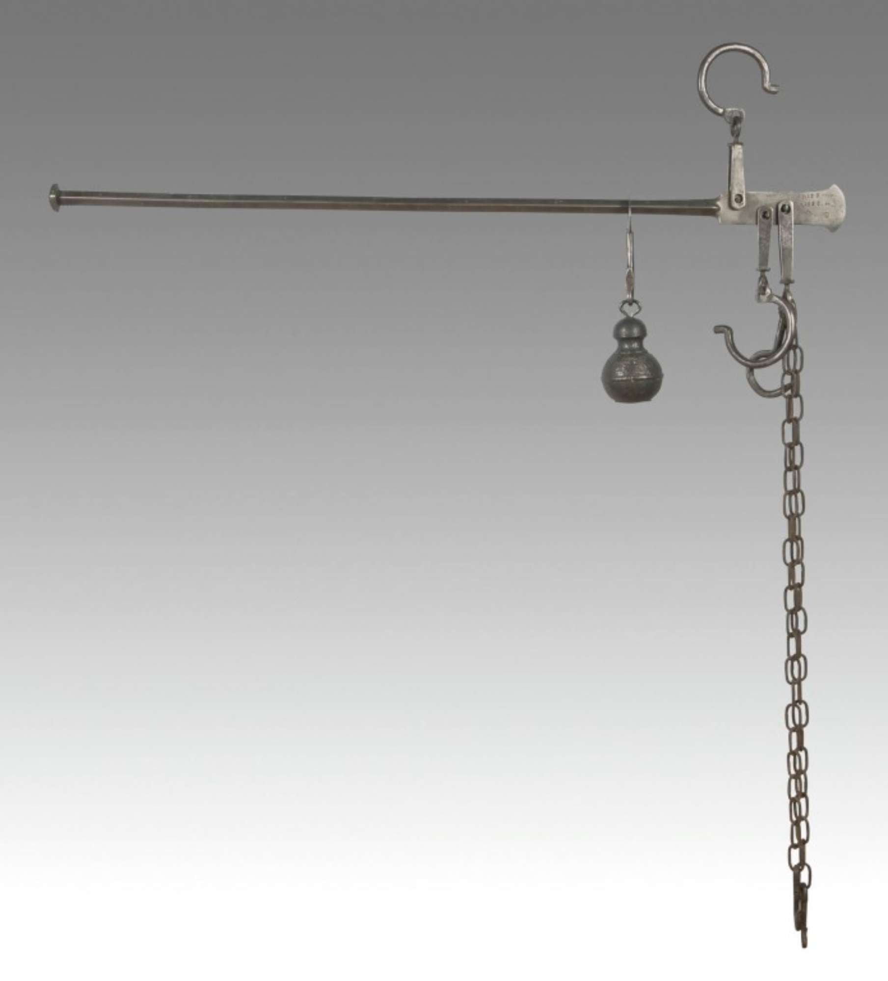 Asta in ferro tarata da 12 a 47 kg, con divisione di 200 g, per la portata minore e da 45 a 137 kg, con divisione di 500 g, per la portata maggiore. Il braccio minore di forma piatta ha i coltelli riportati in acciaio. Il braccio maggiore, a sezione quadrata, termina con una testa quadrata in ferro. Il romano, in ghisa a forma di pera con cappio in ferro, ha il corrente in ferro estraibile terminante con gancio piatto ad uncino arrotondato. La stadera è sospesa mediante staffa, gancio ad occhiello e gancio a C terminante con punta in ferro. La merce è sospesa o mediante due catene alla catalana con anelli allungati in ferro terminanti con due ganci ad uncino, oppure mediante gancio ad uncino in ferro lavorato a mano. Sia il gancio per la merce che le catene sono sospesi ad un gancio ad occhiello e staffa in ferro.