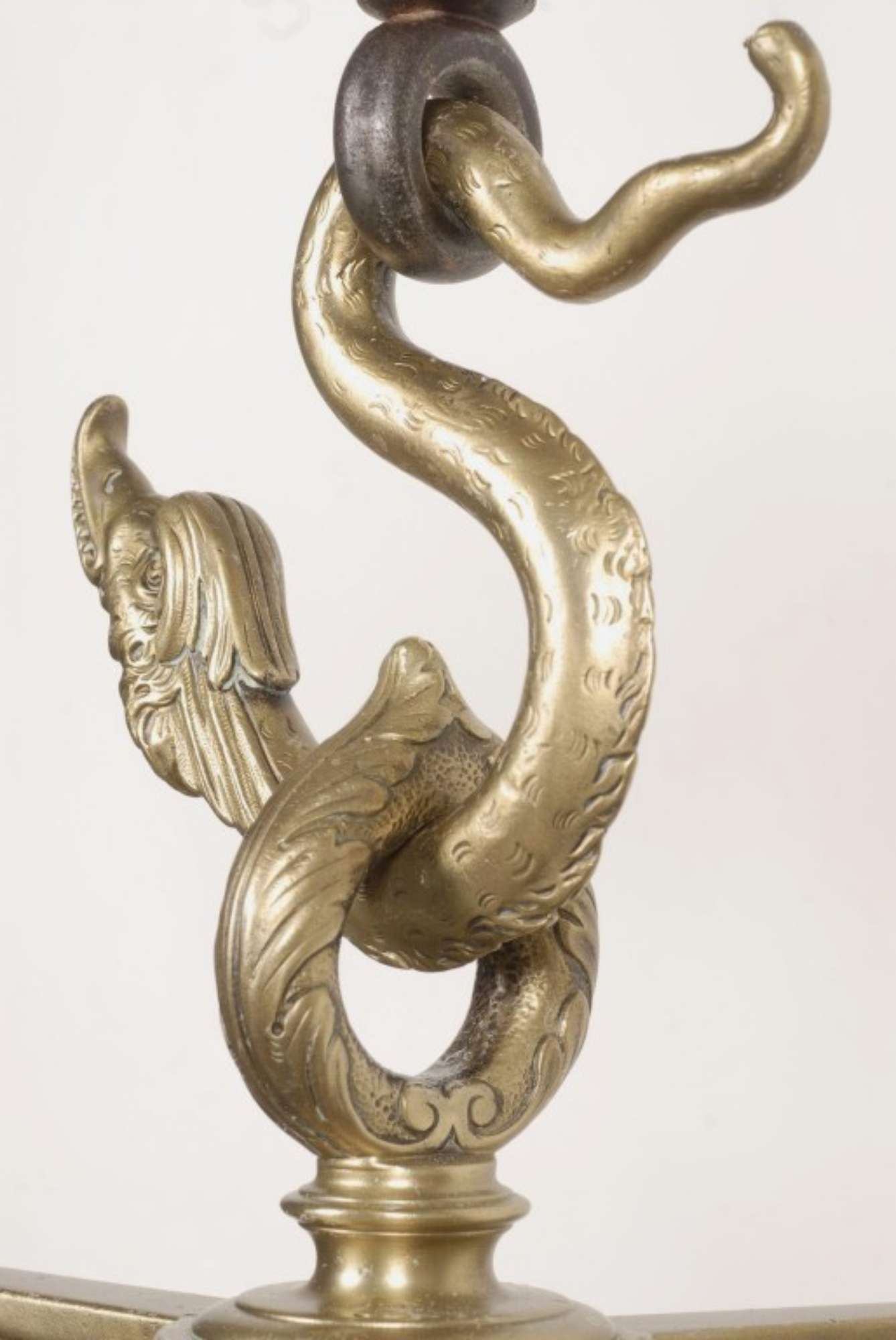 Staffa in ottone con placca con fori per essere avvitata alla parete, decorata da foglie e racemi, apribile per inserire l'estremità dell'asta, mediante una cerniera laterale; la staffa è utilizzata per limitare le oscillazioni dell'asta.