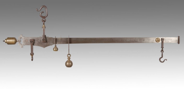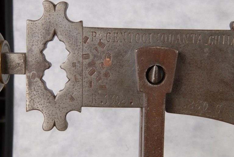 Asta in ferro di forma piatta tarata da 0 a 100 g, con divisione di 20 g per la scala su cui scorre il nonio, e da 0 a 10 kg, con divisione di 100 g per la scala su cui scorre il romano. Il braccio minore, con estremità traforata e contrappeso di forma cilindrica in ottone con massa di correzione regolabile mediante apposita chiavetta in ferro ora mancante, ha i coltelli riportati in acciaio. Il braccio maggiore, terminante con una testa di forma rettangolare con spigoli arrotondati, ha all'estemità un coltello riportato in acciaio che sostiene staffa, gancio ad occhiello e gancio ad uncino arricciato in ferro per i pesi di rapporto attualmente mancanti. Poco prima del coltello per i pesi di rapporto sul braccio maggiore è collocato un doppio medaglione in ottone per bloccare la corsa del romano. Il nonio, in ottone di forma sferica e cavità per la massa di correzione della tara chiusa da una vite in ottone, ha il corrente piatto in ferro non estraibile. Il nonio scorre solo sulla sua scala grazie ad un perno in ferro che ne blocca la corsa. Il romano, in ottone di forma sferica con anello e cavità per la massa di correzione della tara chiusa da una vite in ottone, ha il corrente in ferro piatto estraibile. La stadera è sospesa mediante staffa, gancio ad occhiello decorato da una borchia in ottone e gancio forgiato a mano in ferro a forma di C terminante con un ricciolo. Una staffa ed un gancio ad occhiello decorato da una borchia in ottone reggevano la crociera con le catene ed il piatto entrambi mancanti.