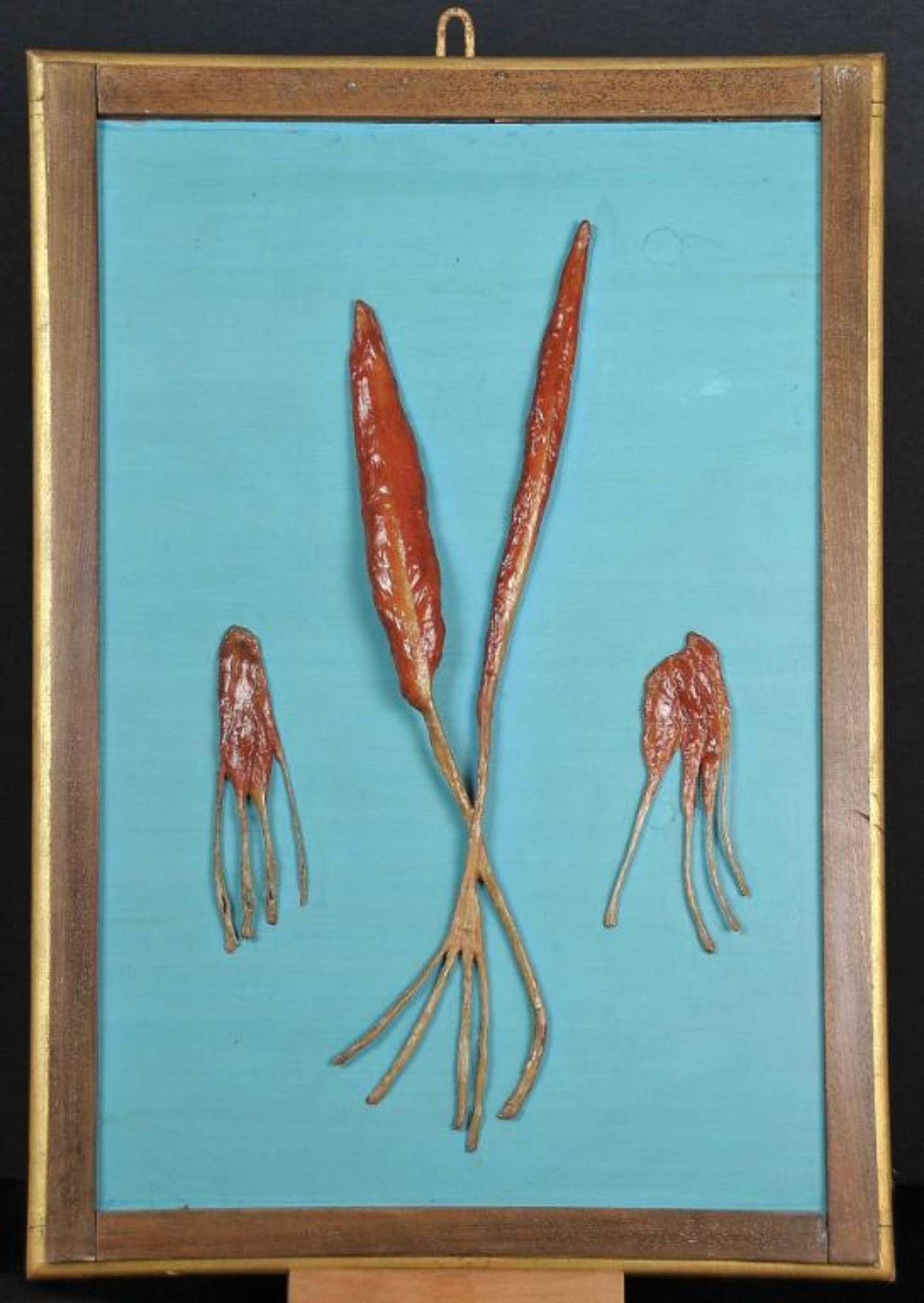 Tavola rettangolare a fondo turchese, con cornice in legno naturale filettata a porporina. La tavola non è coeva al modello anatomico.
