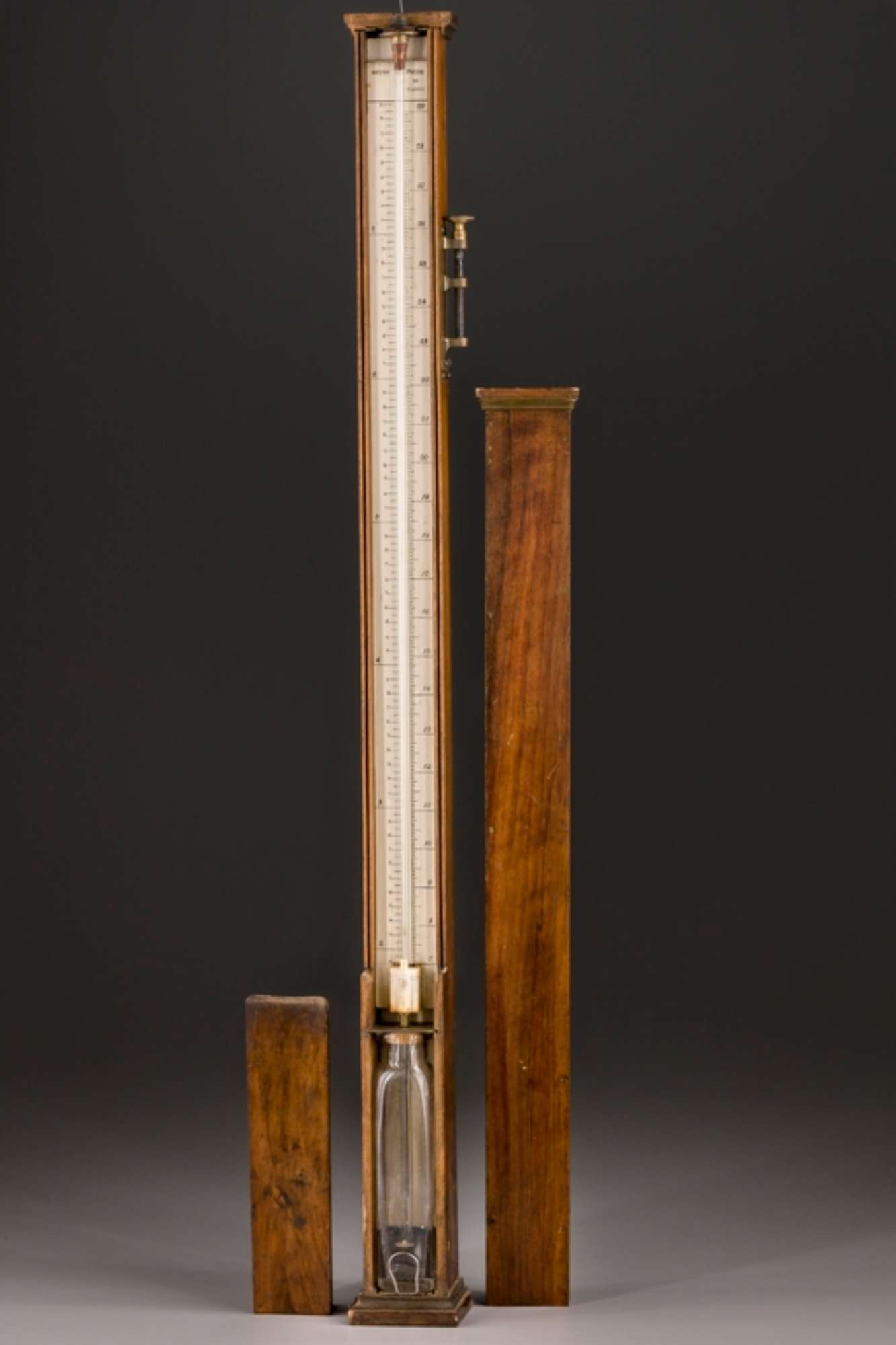Barometro racchiuso in scatola di legno quadrangolare con la parte anteriore apribile. Il mercurio era contenuto in una boccetta a sezione quadrata appoggiata su di una tavoletta estraibile. In essa penetra un filo metallico terminante superiormente con un cilindro di avorio con due marche di riferimento. Il cilindro scorre in un bocchetto d'avorio recante anche esso una marca. Inferiormente il filo reca un piccolo disco di avorio in cui è intagliata una lunula. La scala su legno verniciato è divisa in pollici francesi (da 7 a 29 con divisioni ogni linea) e in centimetri (da 19 a 79 con divisioni ogni 5 mm). Sulle scale le diciture METRO e PIEDE DI PARIGI. La scala è trattenuta da un cursore a molla sul retro dello strumento e viene spostata da una vite micrometrica di ottone posta su di un lato. Il tubo barometrico è spezzato.