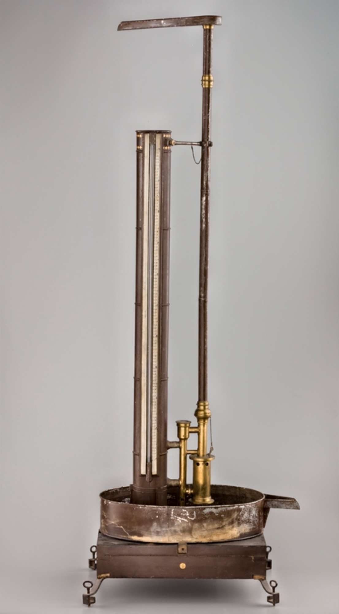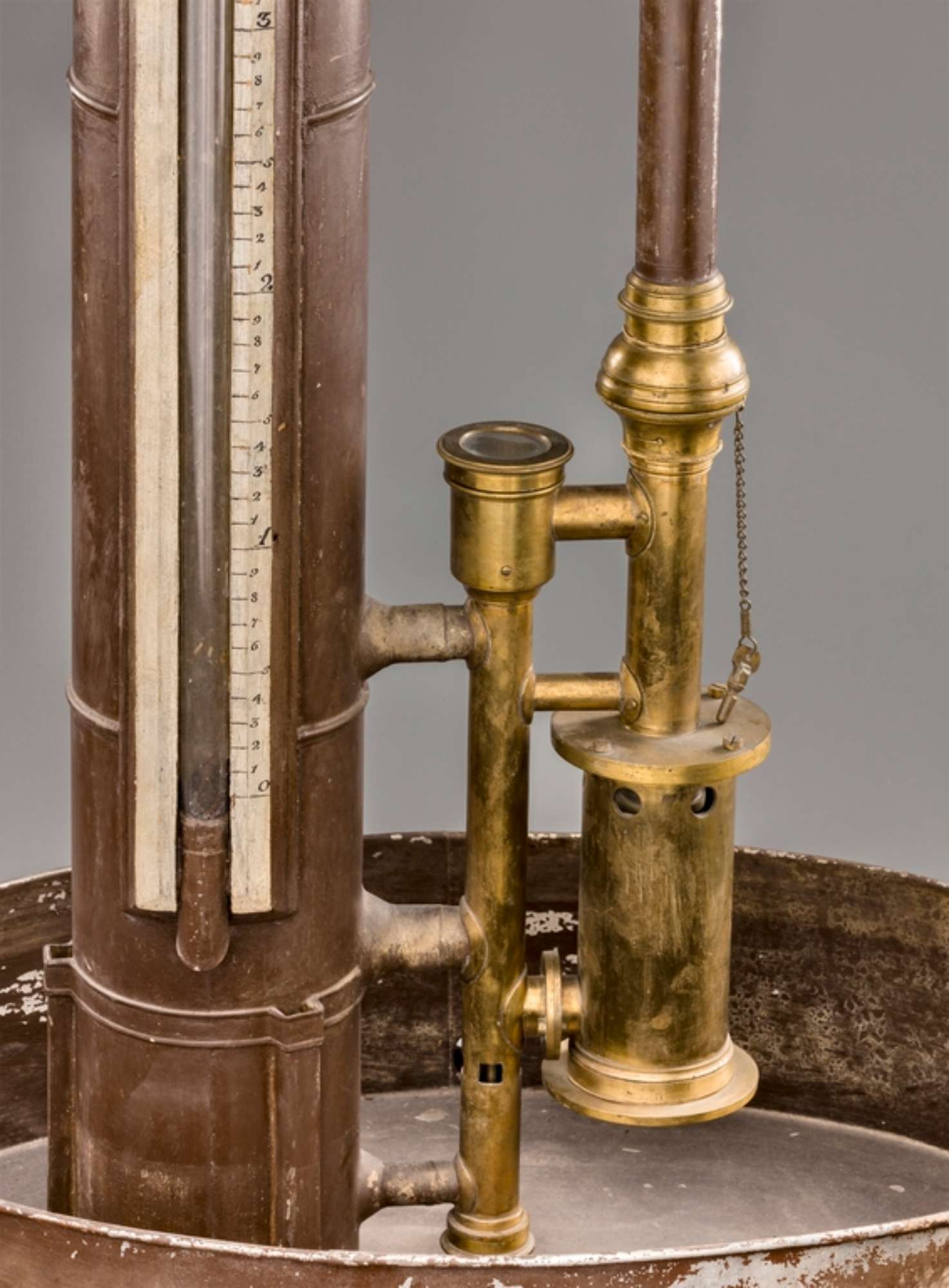 La macchina è montata su di una base di legno con piedi in ferro e viti calanti. In un bacinella di latta, con beccuccio di sfogo, si trova un serbatoio verticale con livello in vetro e scala centimetrata lunga 1 metro. Il serbatoio è collegato inferiormente ad un corto tubo verticale avente una valvola superiore protetta da un coperchio di vetro. Ad essa è collegato un secondo tubo con un recipiente cilindrico d'ottone anche esso munito di valvole. Da esso si diparte un tubo di latta verticale, la cui altezza supera quella del serbatoio, che reca superiormente una canaletta per l'efflusso dell'acqua.