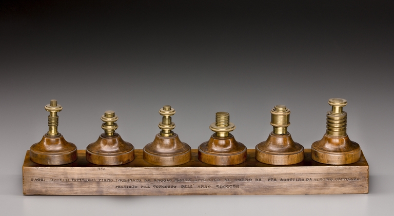 Una base di legno rettangolare reca 6 pomoli pure di legno. Su di essi sono inserite verticalmente altrettante barre d'ottone con filettature diverse. Sette anelli filettati sono avvitati su di esse.