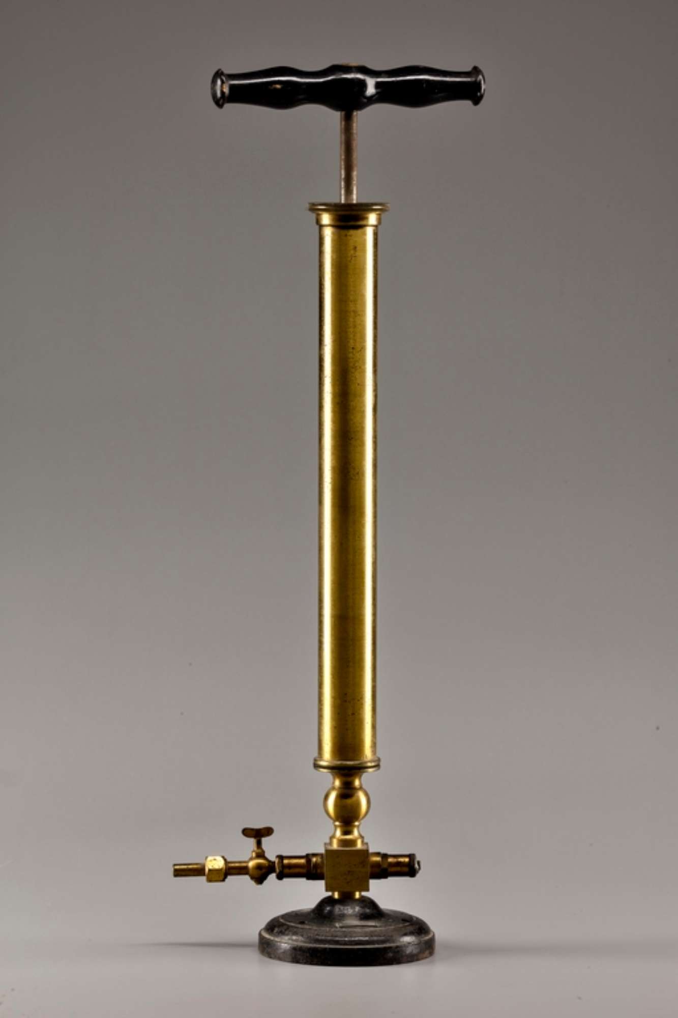 In un cilindro d'ottone montato su di una base in ferro scorre un pistone con asta e manubrio. Alla base della pompa due valvole e un rubinetto.