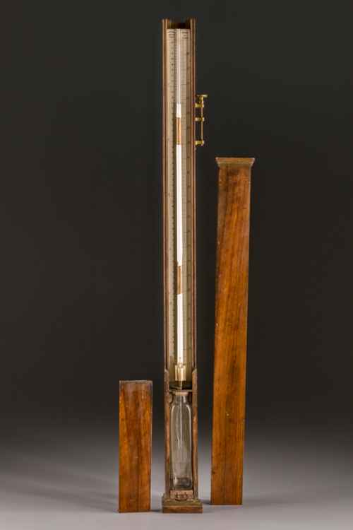 Su una tavola di legno ebanizzato è fissato un tubo barometrico il cui sifone inferiore è racchiuso in una scatoletta. In corrispondenza della sommità del tubo si trova una scala argentata in cm e mm (da 65 a 78 cm) e scala in pollici francesi e linee (da 24 a 29 pollici).
