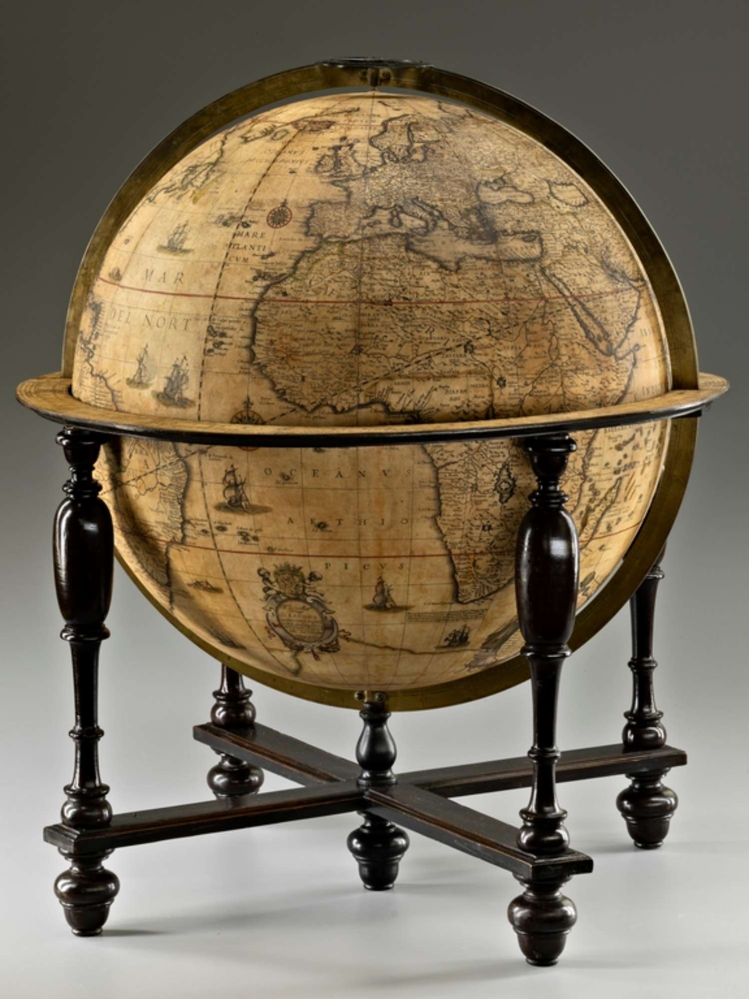 Il globo è munito di base di tipo olandese, con 4 colonne di legno tornite e dipinte di nero connesse da due traverse e da una quinta colonnina centrale più corta che sostiene l'anello meridiano. La corona circolare sostenuta dalle 4 colonnine e ricoperta di carta reca le direzioni geografiche, i venti, i segni zodiacali, i numeri dei giorni e dei mesi. Il globo illustrante il cielo con le sue principali costellazioni e i loro nomi, è inserito in un anello meridiano graduato (elevazione del polo) recante un anello più piccolo circumpolare con le indicazioni delle ore. Il globo, che reca due cartigli, fa il paio con il globo celeste dello stesso autore presente nella collezione.