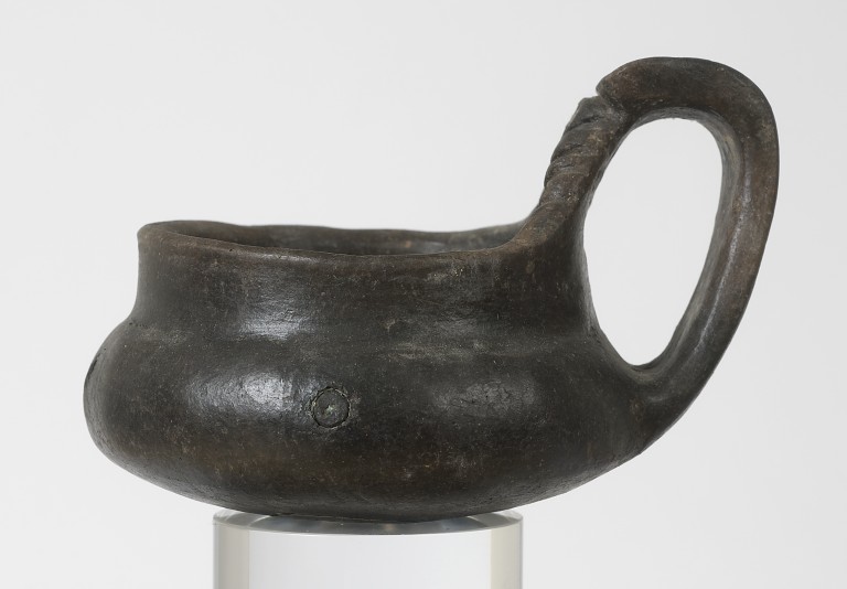 Attingitoio realizzato con impasto nerastro, con superfici lisciate a stecca. Vasca lenticolare schiacciata, breve collo diritto, ansa sopraelevata impostata alla spalla e all'orlo. Piccole borchie bronzee sul fondo interno della vasca e all'attacco interno dell'ansa sull'orlo.