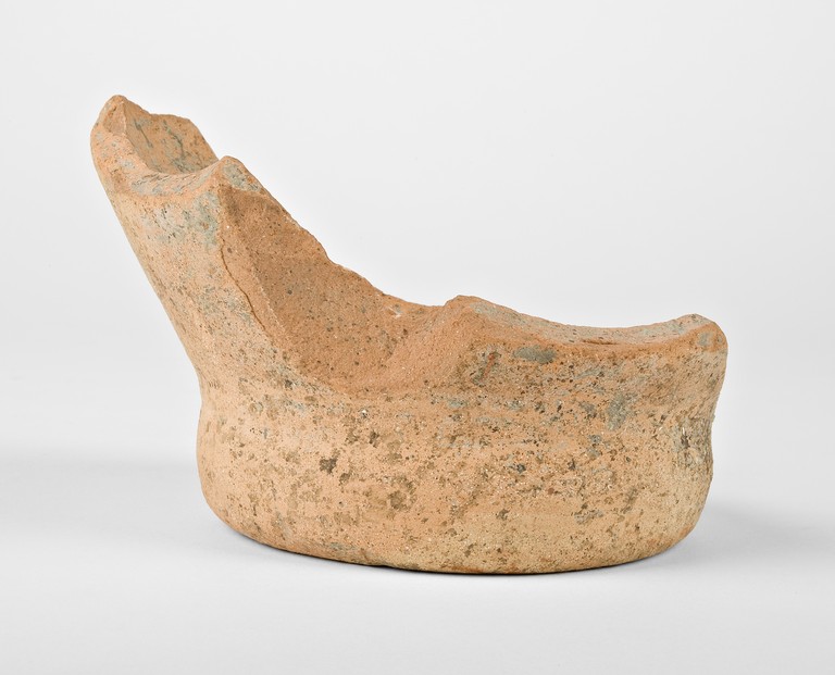 Fondo piano di anfora con largo incavo sulla parete centrale esterna. Per i fondi è molto difficile l'attribuzione ad una forma specifica. Argilla arancione all'interno, nocciola all'esterno.