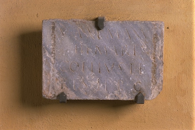 Frammento della parte mediana di una stele anarchitettonica con specchio riquadrato da tratto incavato a sezione curva. Iscrizione su 4 linee.