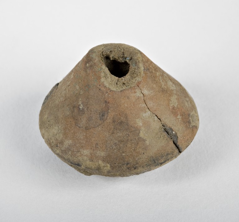 Fuseruola troncoconica con pareti a profilo appena ricurvo e spigolo di base arrotondato. Priva di decorazione. Residui di bronzo attorno al foro di base.