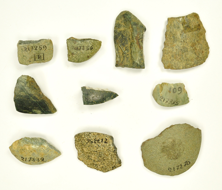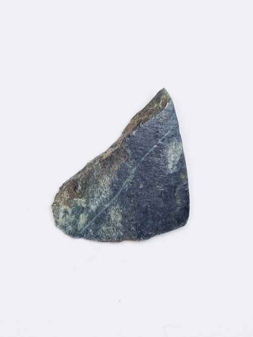 Tagliente di ascia o accetta, di colore verde chiaro macchiettato, in visione frontale debolmente arcuato. Levigatura molto accurata.