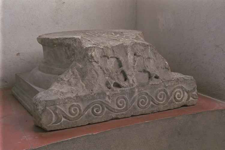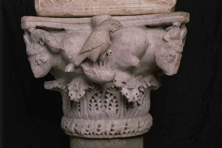 Il capitello, suddiviso in due ordini distinti da un listello liscio, presenta la corona superiore decorata da una serie di protomi di aquile disposte sugli spigoli dell'abaco, quasi a sostenerli con le ali, alternati a protomi di leoni ed arieti sporgenti al centro di ogni faccia. La parte inferiore è è percorsa da un sinuoso racemo di vite che si espande orizzontalmente, ricco di grappoli e foglie segnate da profonde nervature. Il toro è aggettante ed è caratterizzato da un motivo di foglie di alloro piane, disposte simmetricamente attorno ad un ramo diritto.