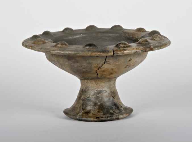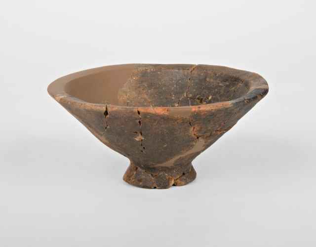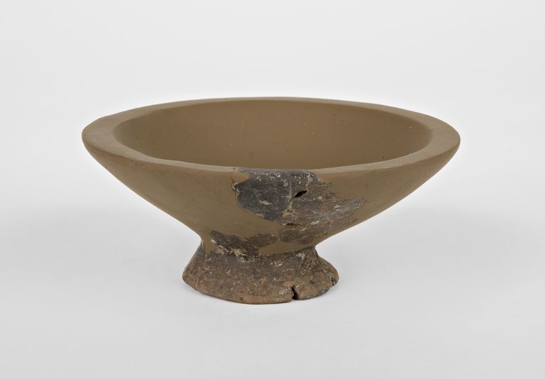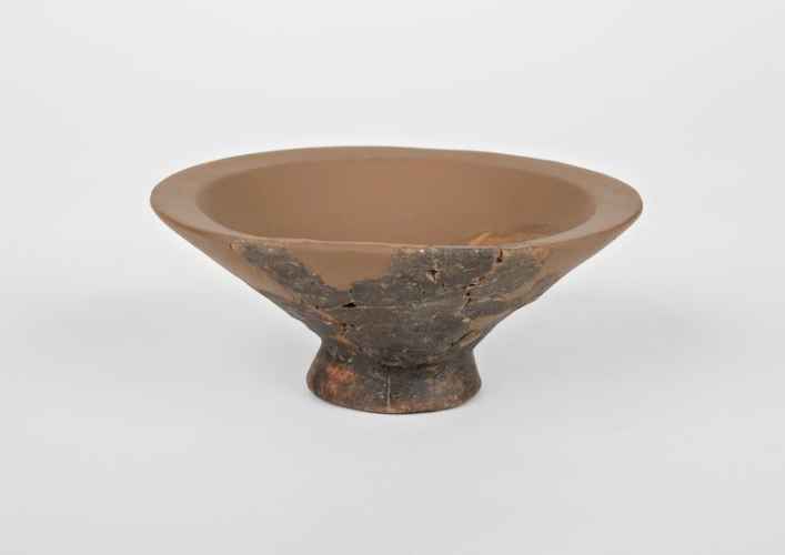 Piattello in ceramica d'impasto; vasca troncoconica a profilo rettilineo con labbro arrotondato ed orlo piano, piede cavo troncoconico.
