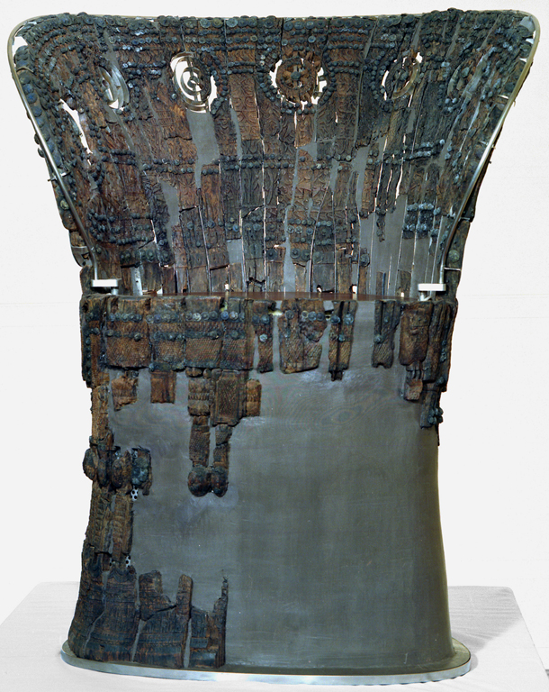 Decorazione esterna con motivi geometrici, all'interno dello schienale con scene figurate su due registri, con figure animali, umane, rappresentazione di abitazioni, telai e carri.