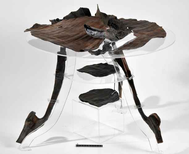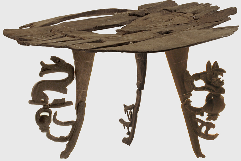 Tavolo a piano rotondo con tre gambe oblique sagomate con decorazioni figurate di cui due conservate, che rappresentano rispettivamente una fiera a fauci spalancate ed un serpente.