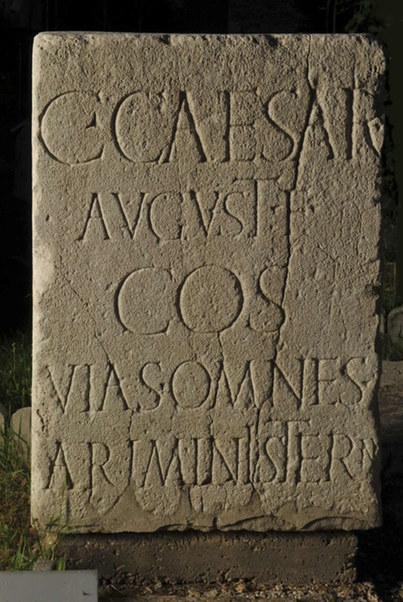 Cippo in marmo iscritto di particolare interesse per la menzione della lastricatura delle strade di Ariminum promossa dal nipote di Augusto, Caio Cesare. L’iscrizione in base al testo che ricorda il consolato di questo alto personaggio è databile con sicurezza all’1 d.C. Il ductus delle lettere è quello tipico delle iscrizioni ufficiali; i caratteri sono resi più evidenti da una rubricatura in nero attribuibile all’allestimento museale prebellico.
