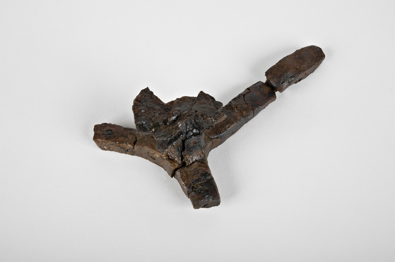 Treppiede in ferro, lacunoso, con un solo braccio integro lungo 6,5 cm.